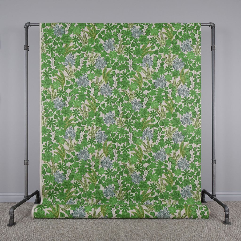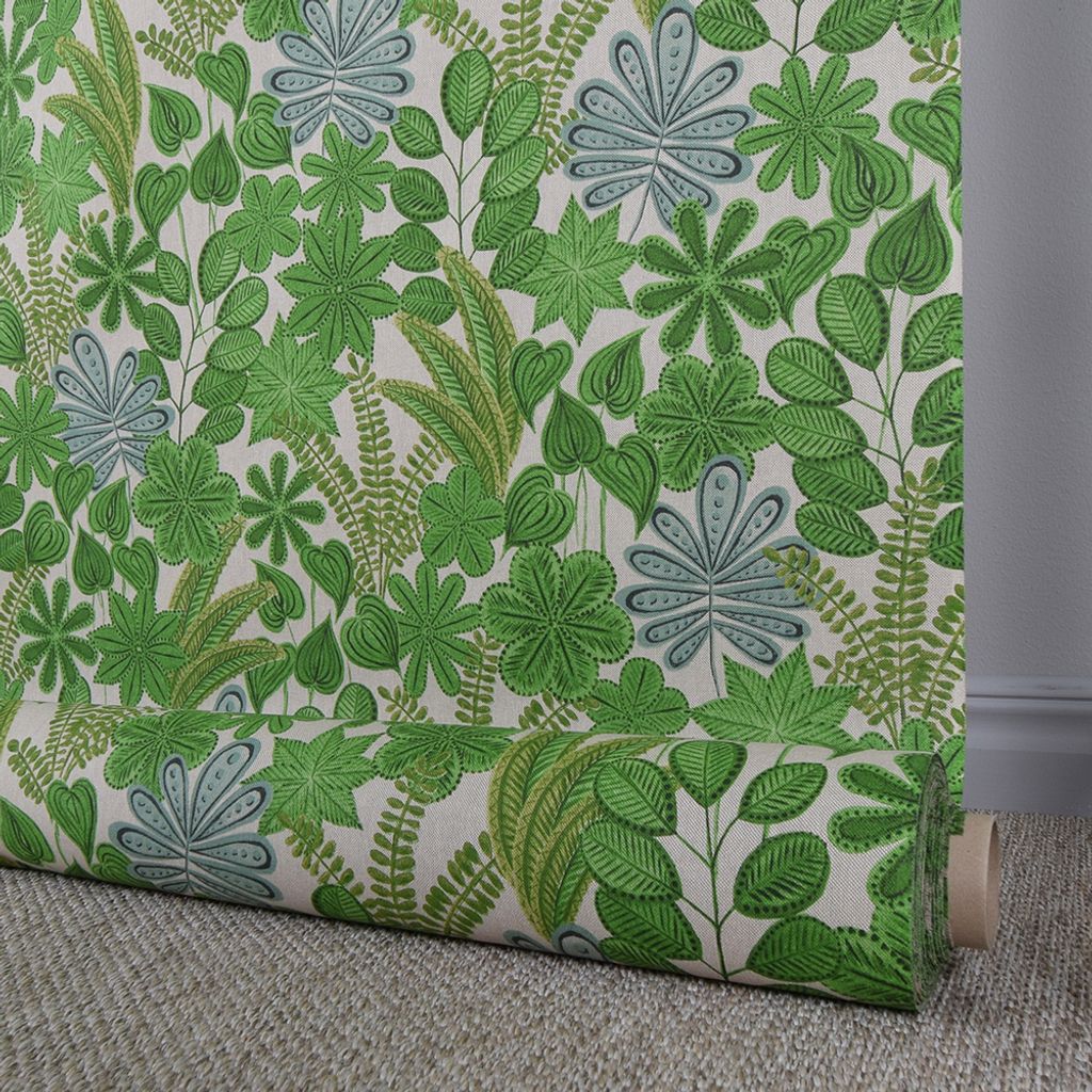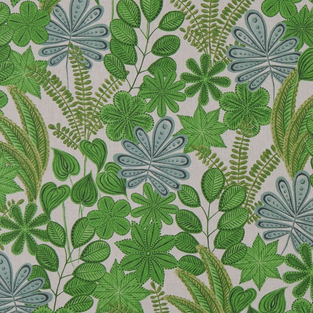 Grönskande tyg till gardiner och inredning med linne look botten och gröna blad. Linenlook halv Panama Premium