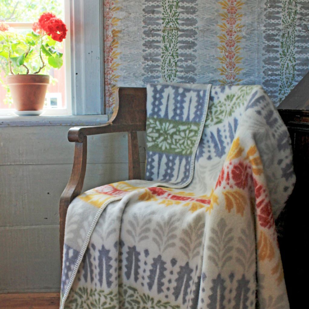 Vacker ullpläd med mönster inspirerat från schablonmålningar som finns i flera av världsarvsgårdarna i Hälsingland.