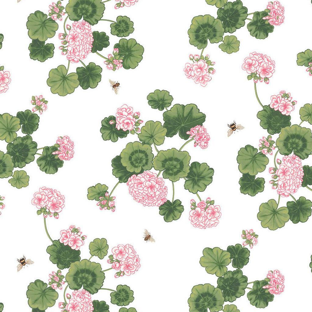 Beskrivning av Astrid Rosa Tyg med Pelargoner