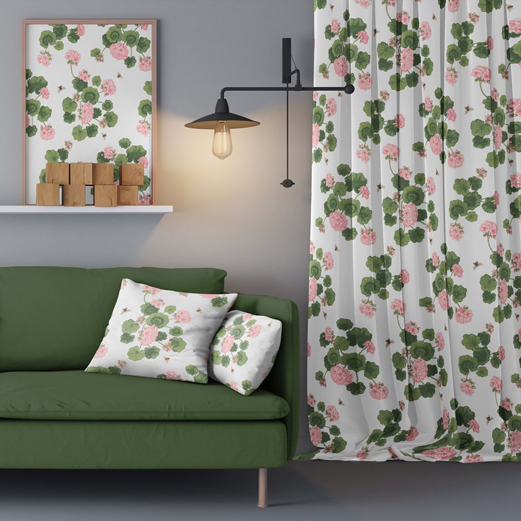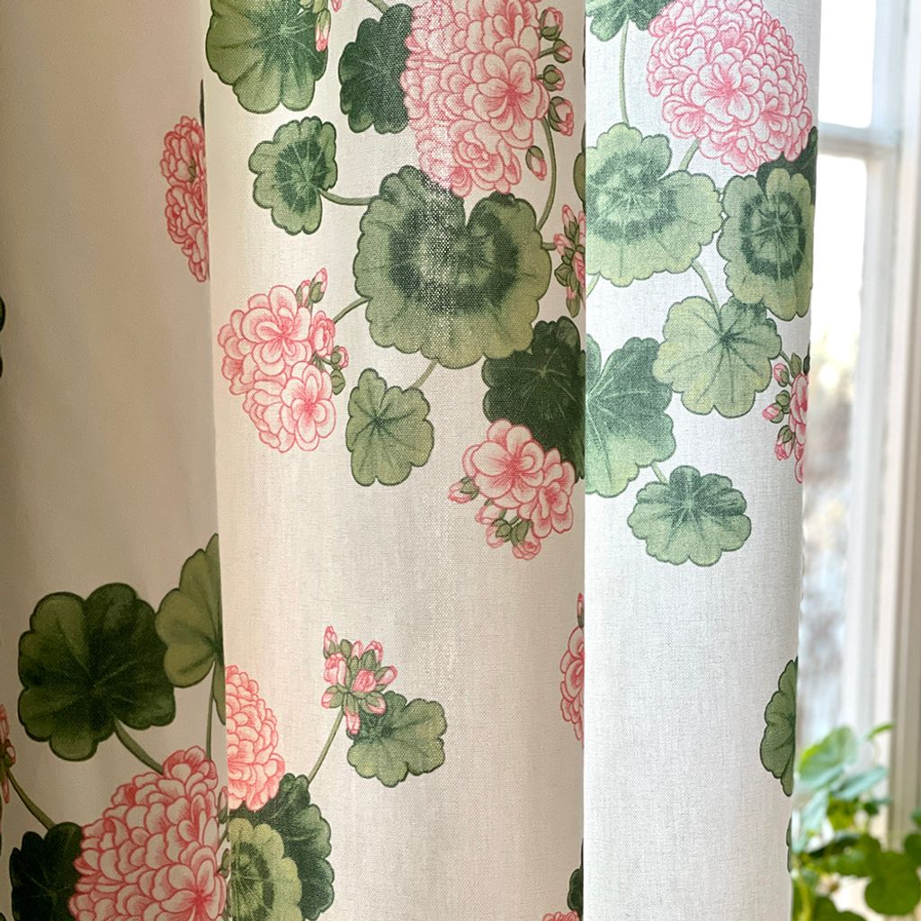 Tyg med ett vackert tidlöst mönster av rosa Astrid pelargoner. Gardin och inredningstyg för hemmet och kontoret. Mönstret är tryckt på en fin bomullsvara. Andra bilden visar mönstrets tryck på tygets hela bredd.
