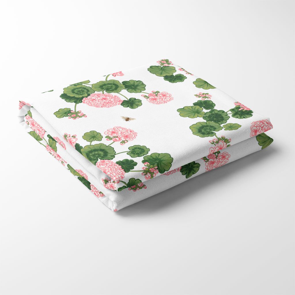 Bordsduk med ett vackert tidlöst mönster av rosa pelargoner, design av Mialotta Arvidsson-Mars.
