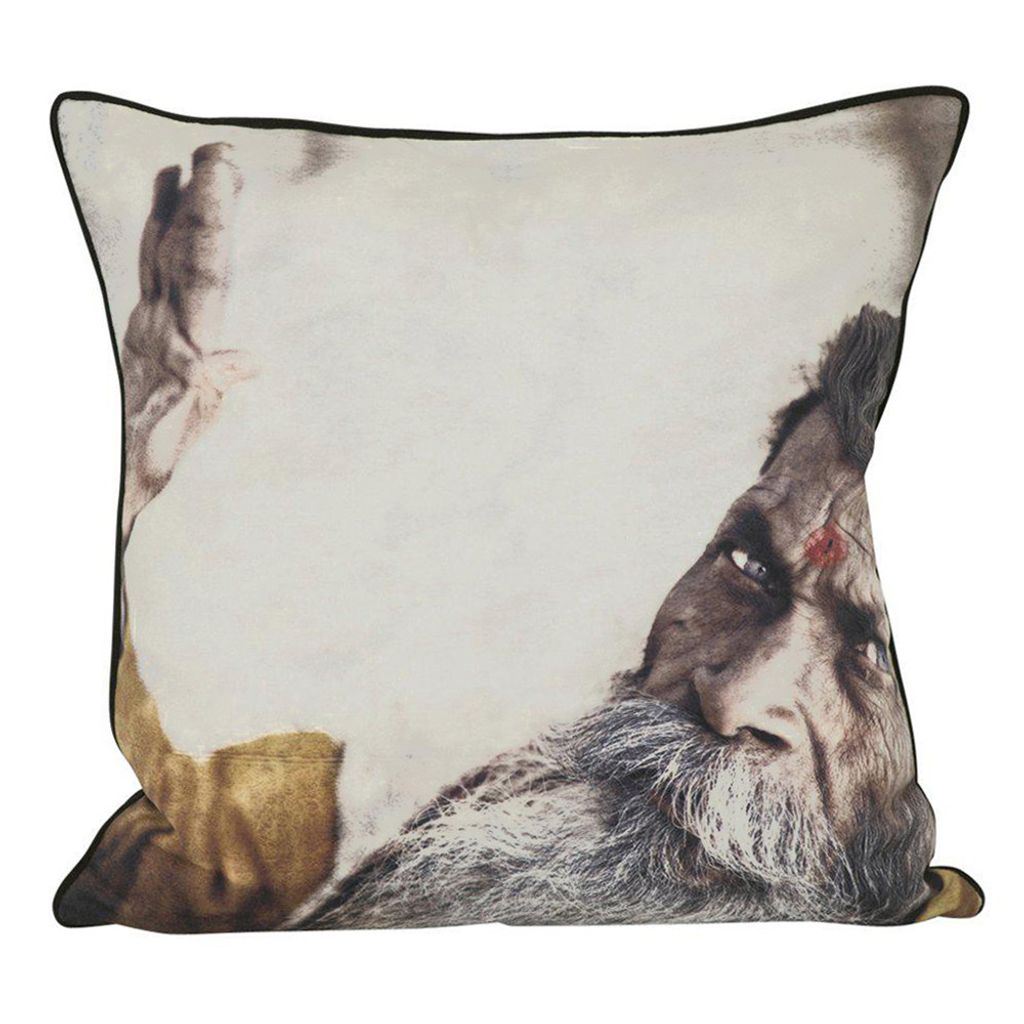 Sammets kudde med ett tryckt motiv på ena sidan och enfärgad svart på baksidan.