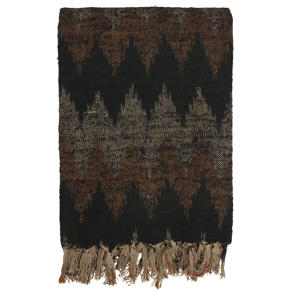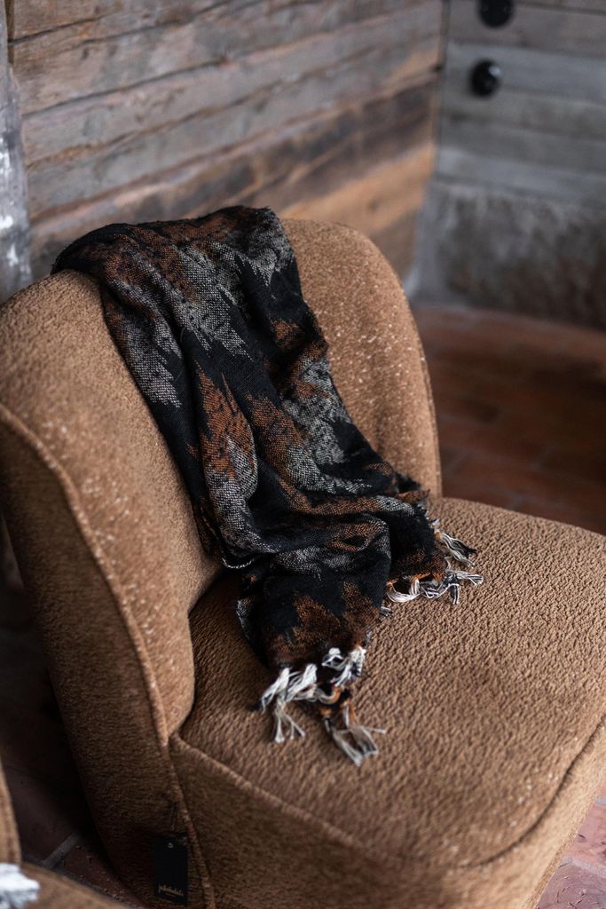 Aurora pläd är en karaktärsfull textil som direkt fångar blicken med sitt dekorativa mönster i svart, rost och naturtoner. Den grafiska designen ger pläden ett levande och spännande uttryck samtidigt som färgskalan skapar en varm och ombonad känsla.
