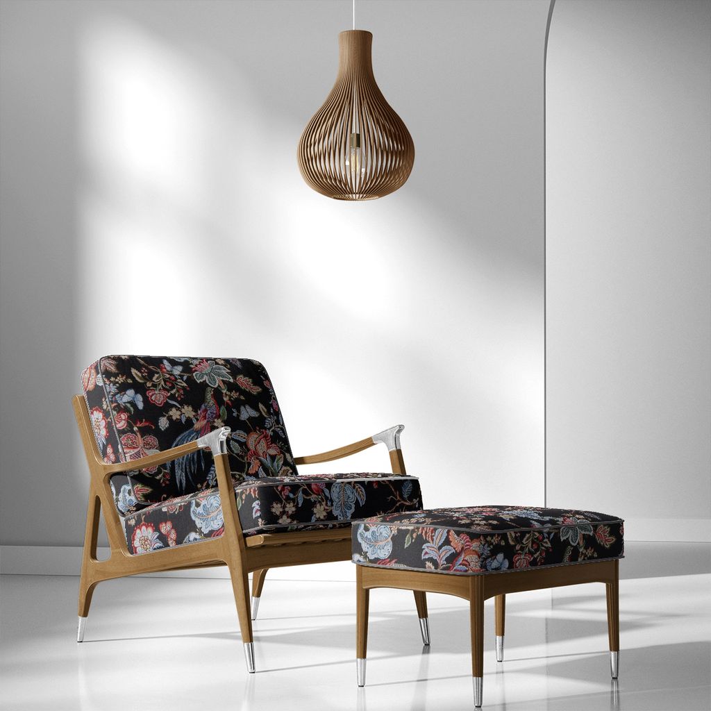 Bailey vackert mönstrat möbeltyg med svart botten med mönster av fåglar, blad och blommor.