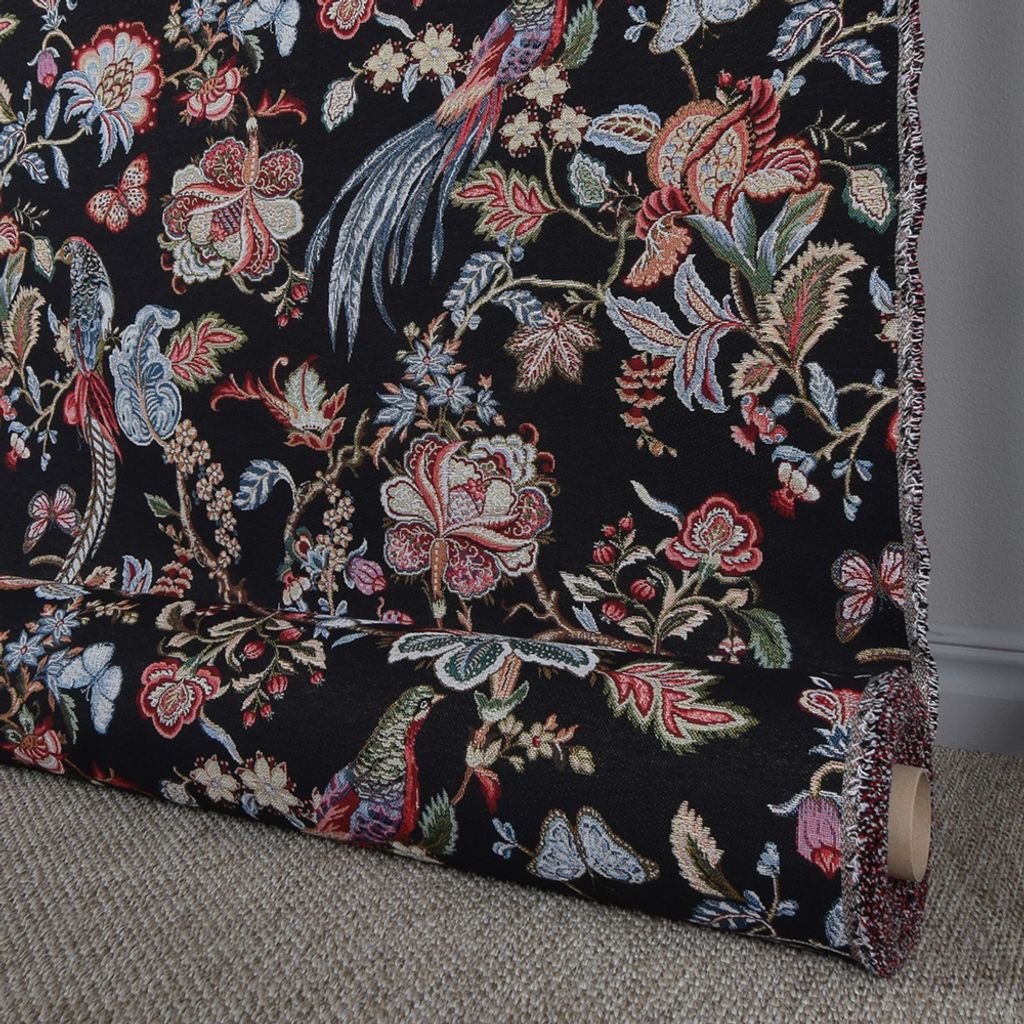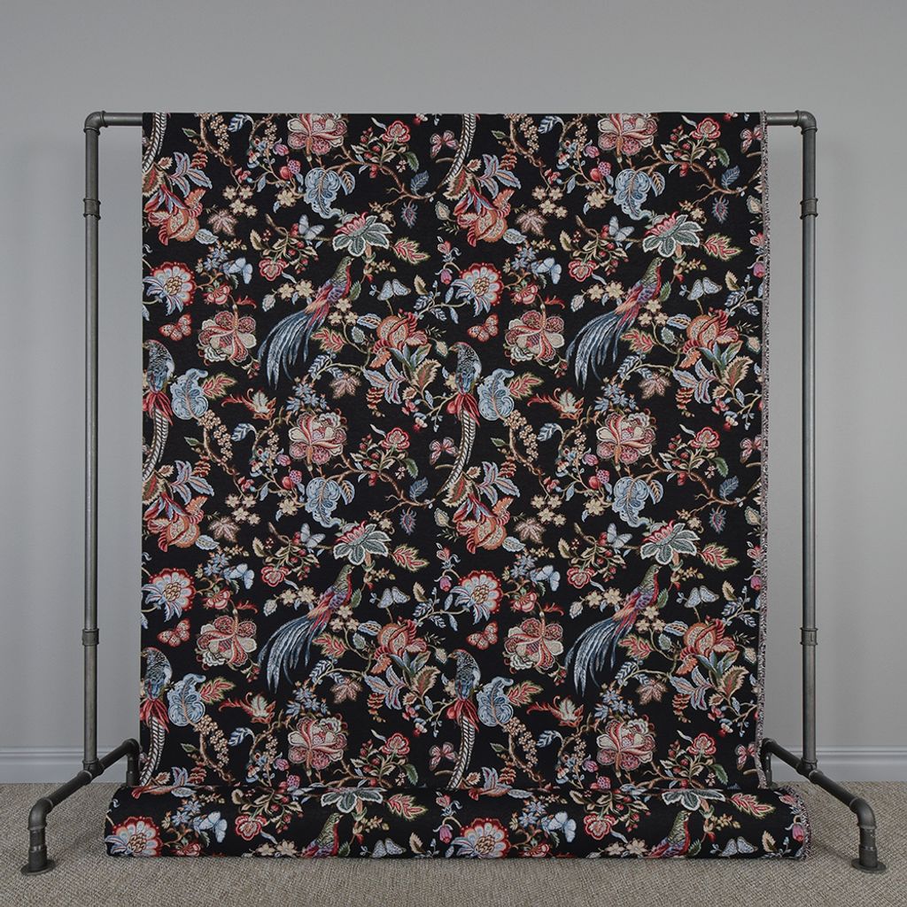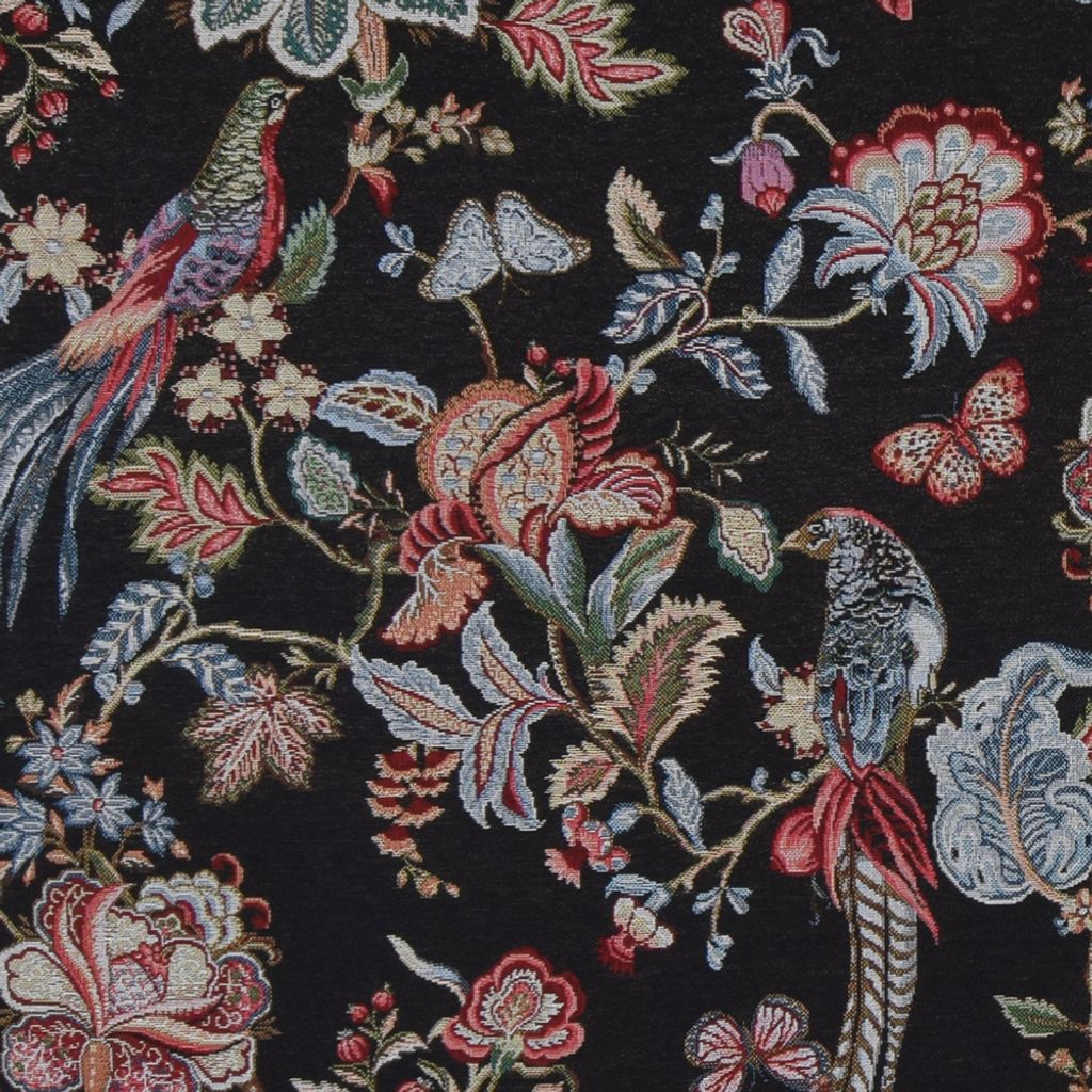 Gobeläng tyg på metervara med svart botten med mönster av fåglar, blad och blommor. Tyget är följsamt så det passar perfekt till draperier, tyngre gardiner och stolsdynor.