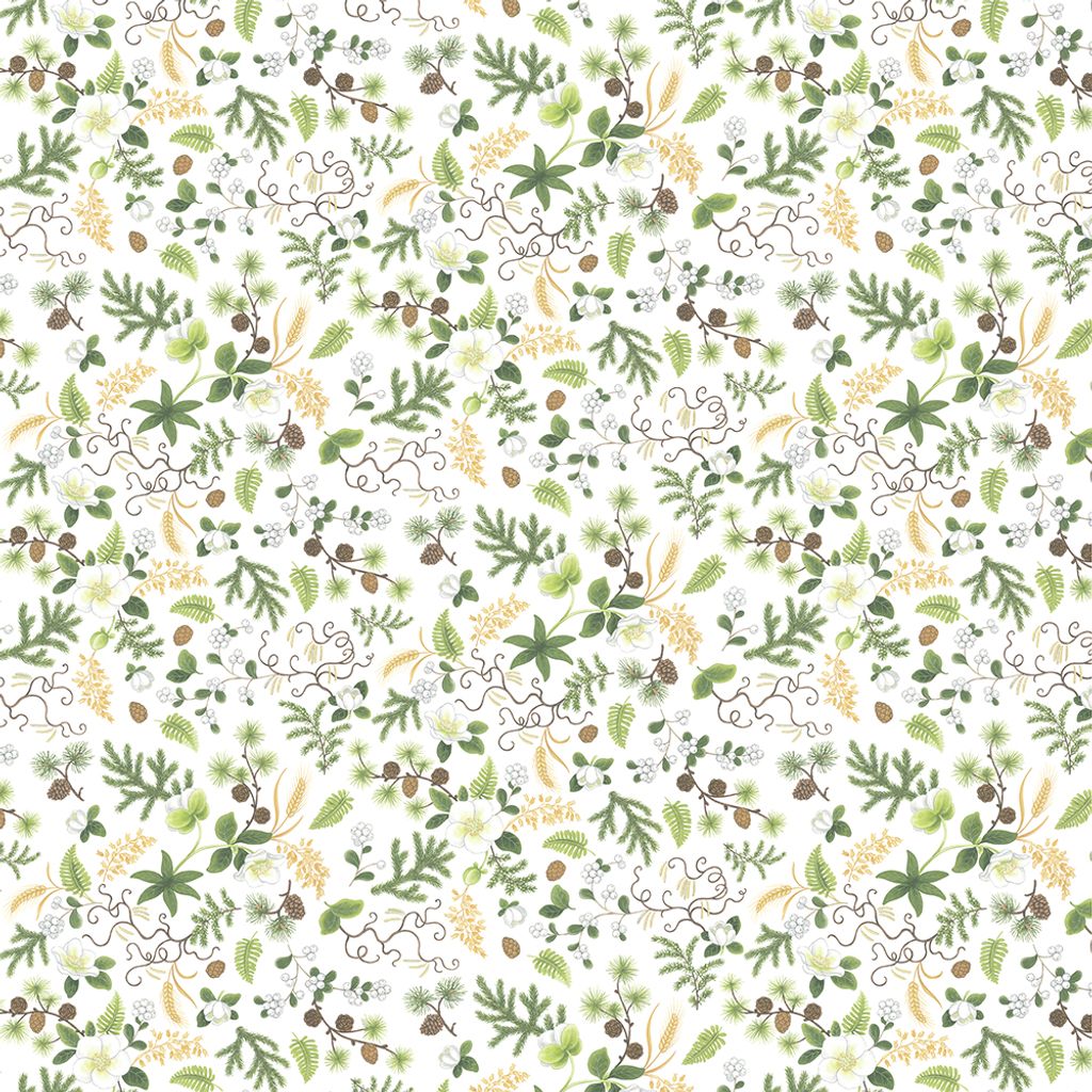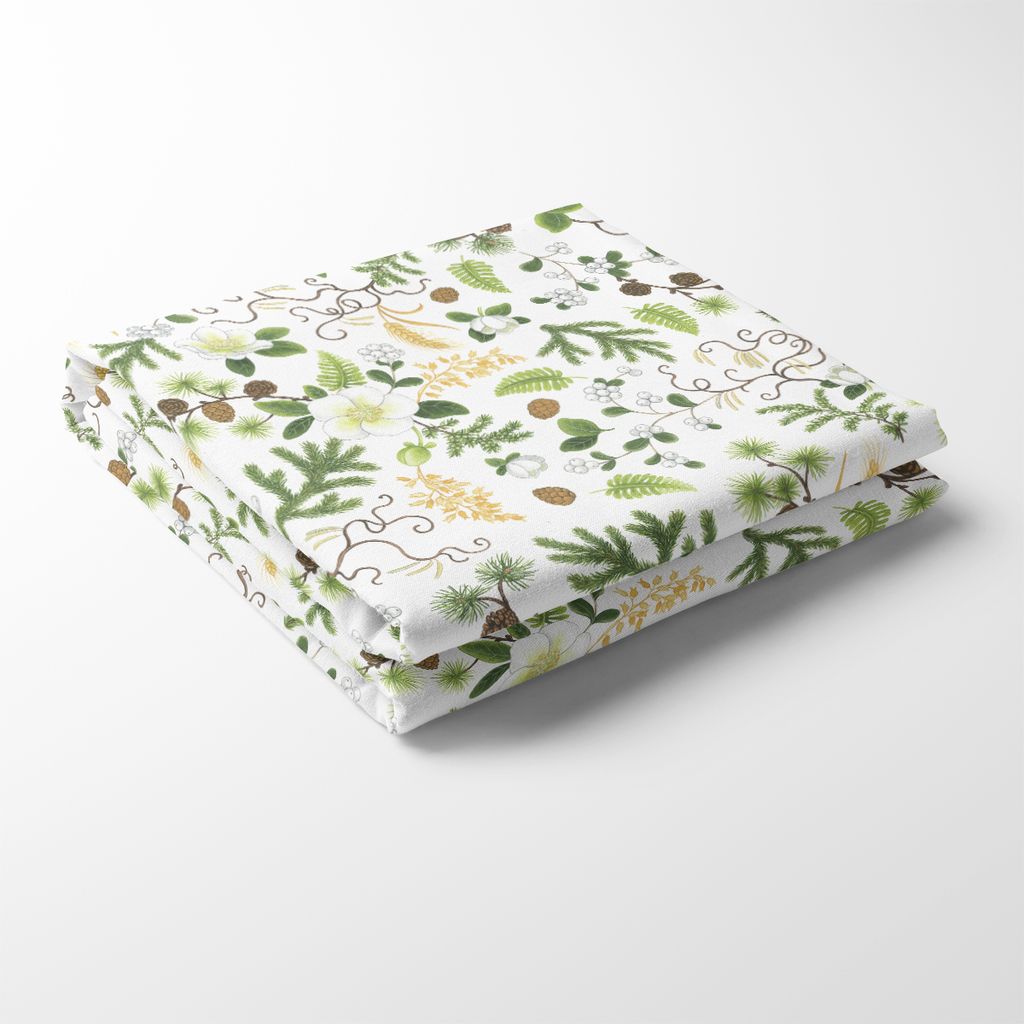 Barr & Blom bordsduk är en hyllning till den nordiska skogen – där granens barr möter mjuka blommor, slingrande grenar, skira ormbunkar och små kottar. Designen är ett botaniskt konstverk som för tankarna till stillsamma skogspromenader och naturens rikedom. Den detaljrika kompositionen är tryckt på en vit bas och förmedlar en fräsch och samtidigt ombonad känsla.