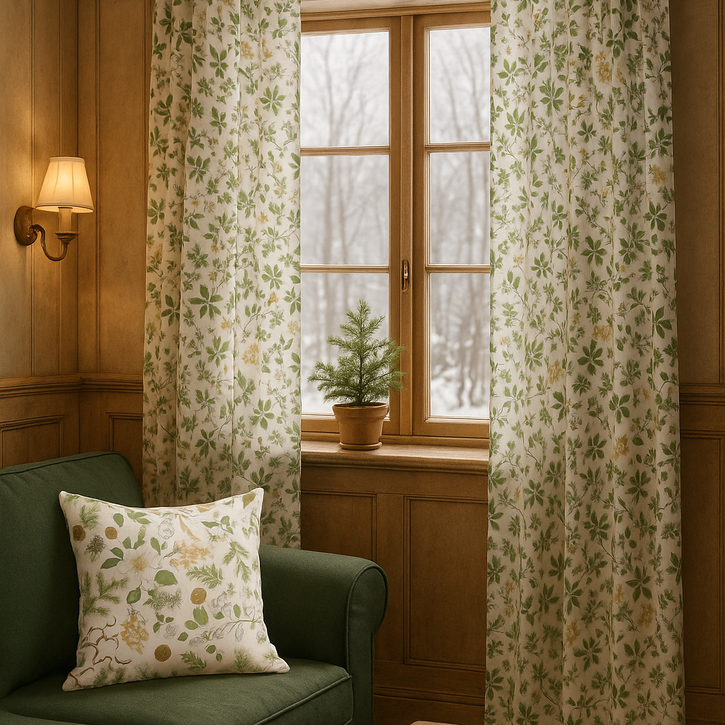 Ett harmoniskt gardinpar med botaniskt mönster i grönt, gult och brunt mot offwhite botten. Barr & Blom ger ett mjukt och naturinspirerat uttryck som passar perfekt i både lantliga hem och skandinaviska miljöer.