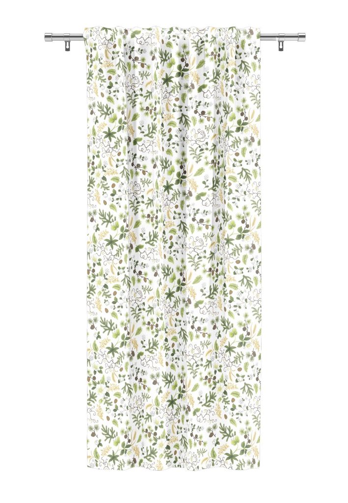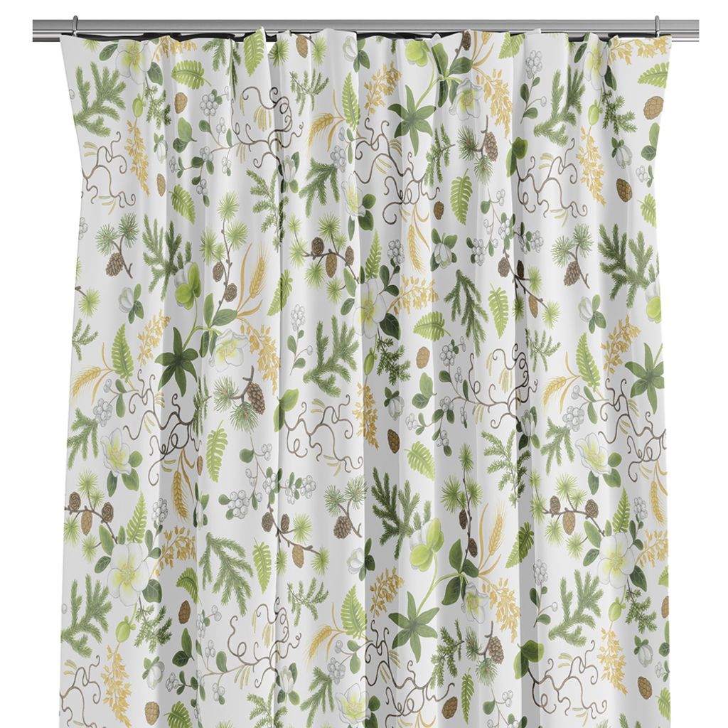 Låt naturen ta plats i ditt hem med Barr & Blom offwhite gardiner. Mönstret är en hyllning till skogens stilla skönhet, med barrkvistar, löv, kottar och blommande inslag som tillsammans skapar ett levande, men samtidigt harmoniskt uttryck. Den vita bakgrunden ger en ljus och luftig känsla som förhöjer rummets rymd, medan de gröna och gyllene nyanserna bidrar med värme och naturkänsla..