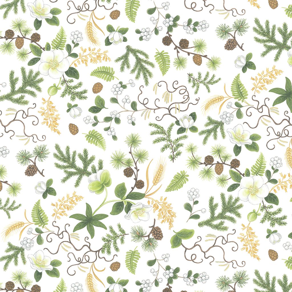 Barr & Blom – Offwhite är en naturnära metervara från Arvidssons Textil, designad av Mialotta Arvidsson-Mars. Det livfulla mönstret består av gröna barr, små blommor och blad som slingrar sig över en mjuk offwhite bakgrund.
