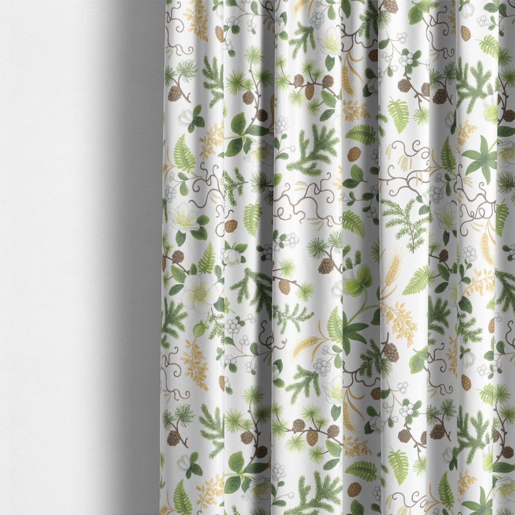 Ett mjukt och naturligt mönstrat tyg med gröna barr och blommor på offwhite botten. Harmoniskt bomullstyg för hemmet.