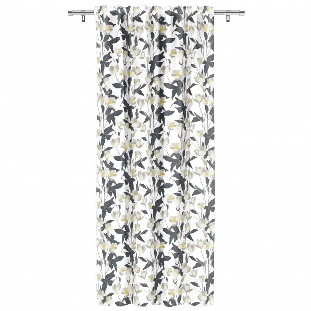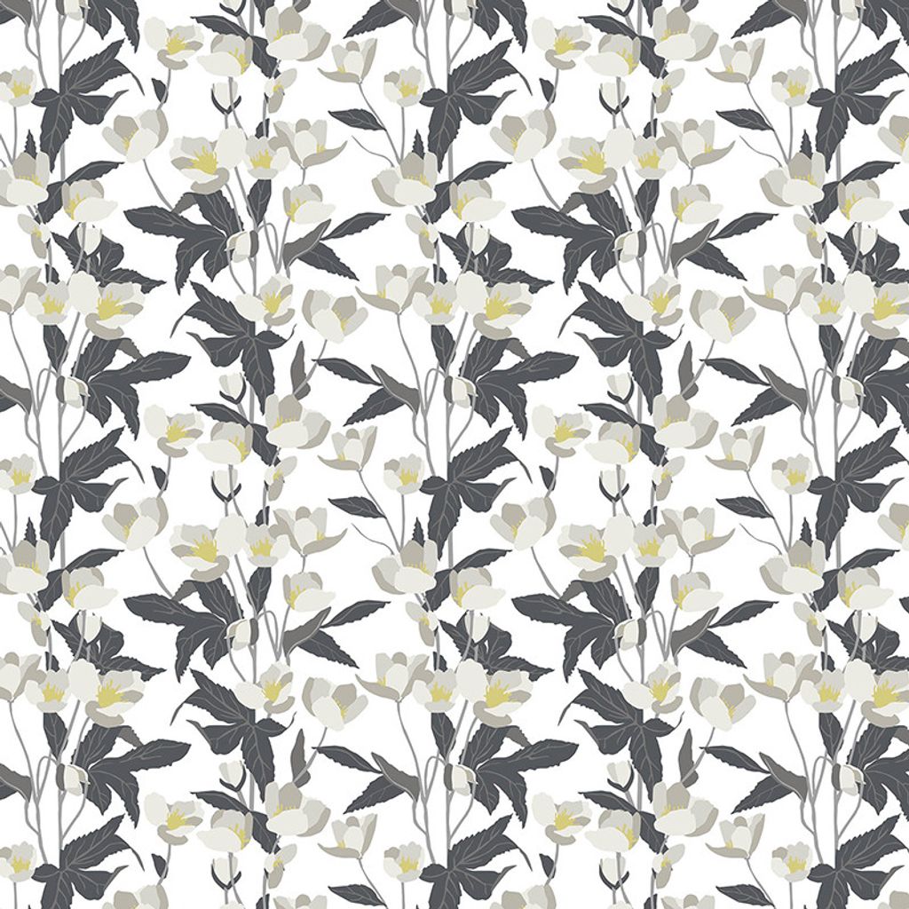 Mönstrat blommigt tyg i vitt, grått och gult.