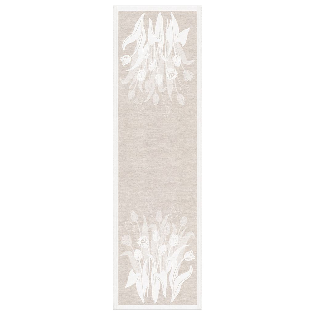 Belle löpare 35x120 cm är en elegant bordslöpare i ljusa, naturliga toner med ett stilrent tulpanmönster som skapar en lugn och romantisk känsla i dukningen.