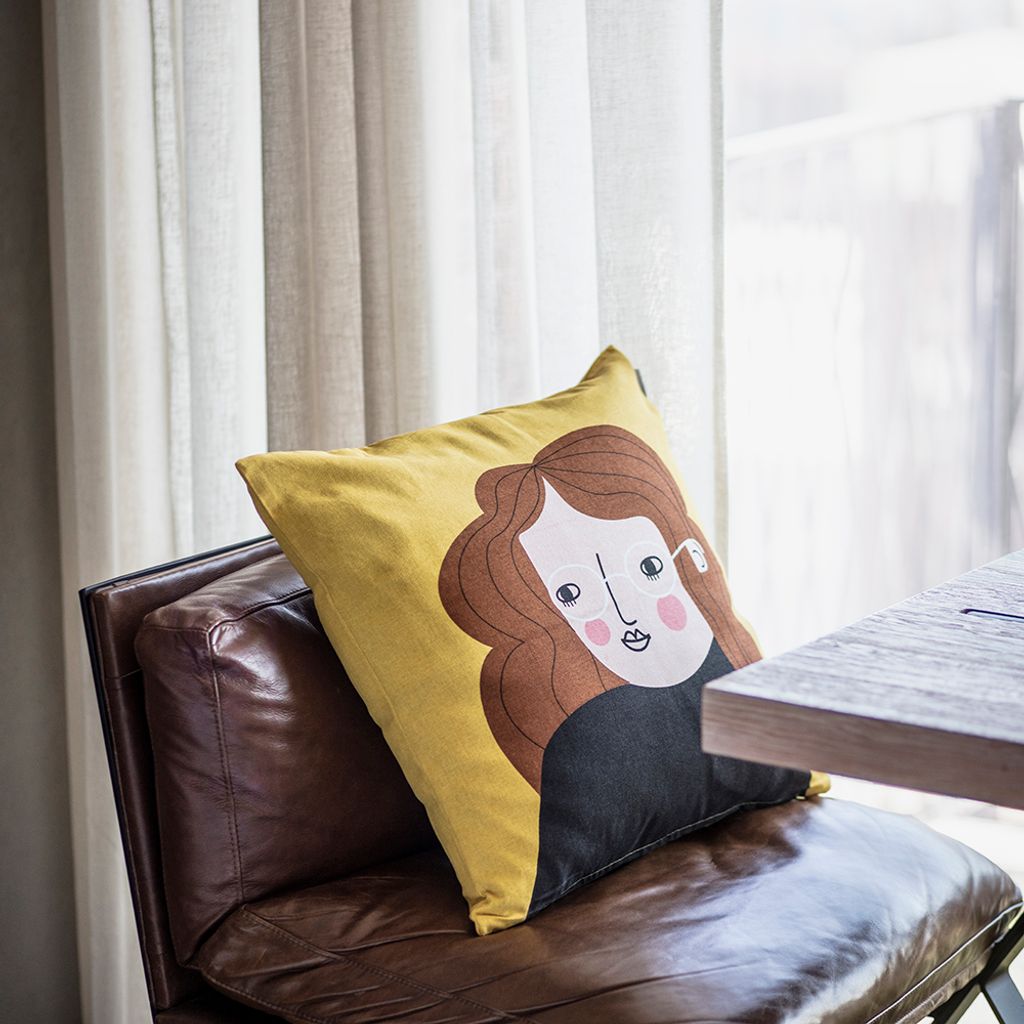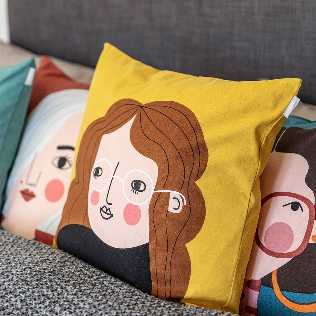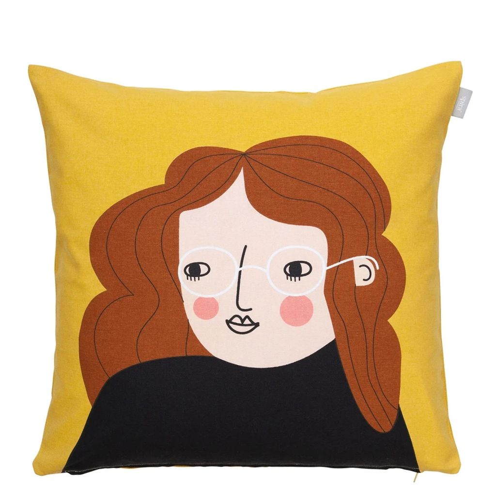 Möt Bia – den resglada personligheten från Spira of Sweden! Detta handtryckta kuddfodral fångar hennes varma och äventyrliga själ perfekt. Med sitt lockiga hår, sina drömmande ögon bakom runda glasögon och en bakgrund i solig gul nyans, sprider Bia energi och glädje i vilket rum hon än placeras.