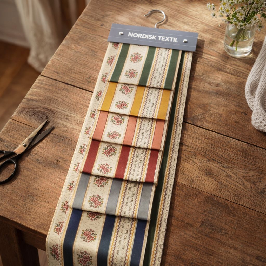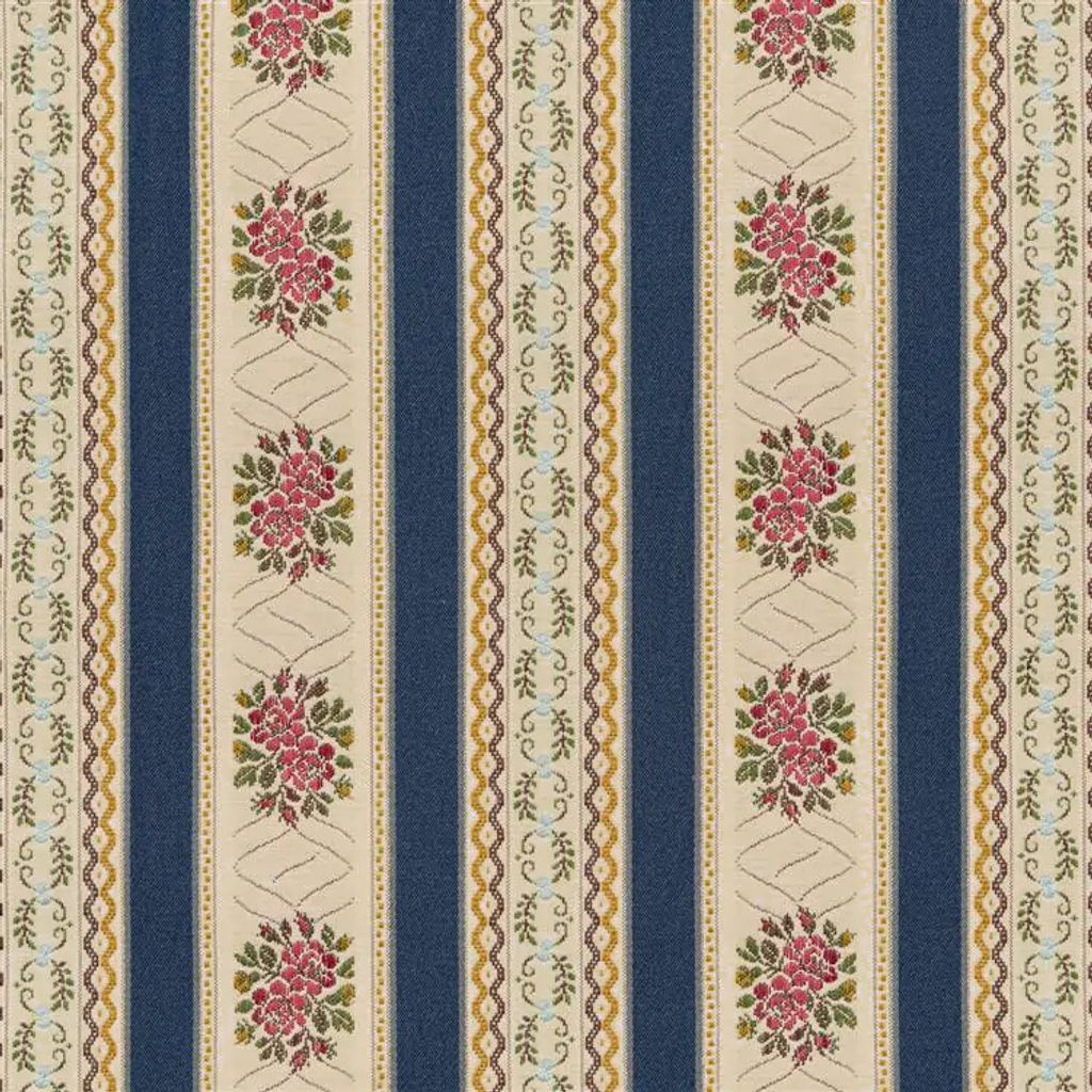 Bianca mörkblå randigt stiltyg är ett vackert möbeltyg i klassisk stil, inspirerat av traditionella svenska herrgårdsmiljöer. De mörkblå ränderna kombineras med romantiska blomsterbårder i rosa och grönt, samt små ornamentala detaljer som ger tyget ett rikt och levande uttryck.