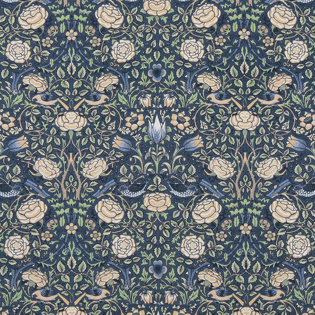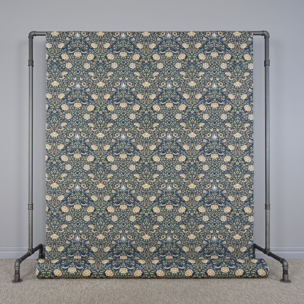 Digital tryckt tyg med William Morris mönster för gardiner, inredning och lättare möbelklädnad. Tyget har marinblå botten, blå och beigea blommor och fåglar och gröna blad.
