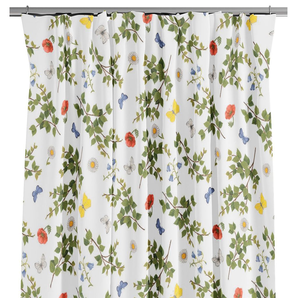 Gardiner med vit botten och sommarblommor, fjärilar och björklöv.