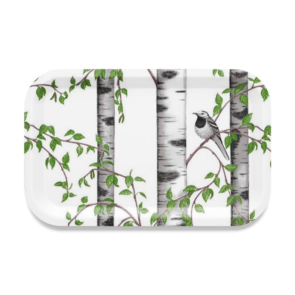 Rektangulär bricka i trälaminat med motivet Björkdungen ifrån Arvidssontextil.