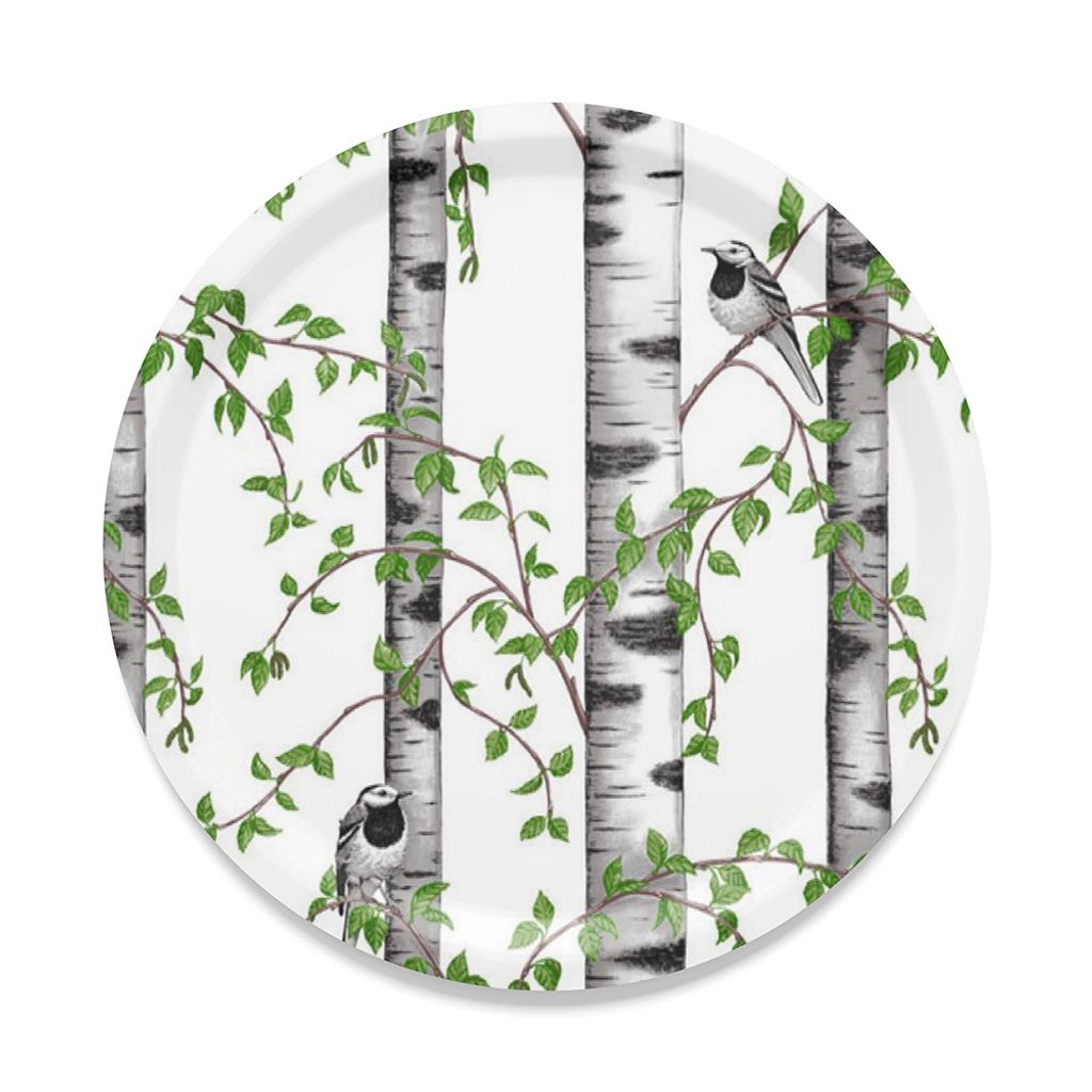 Rund bricka i trälaminat med motivet Björkdungen från Arvidssons textil.