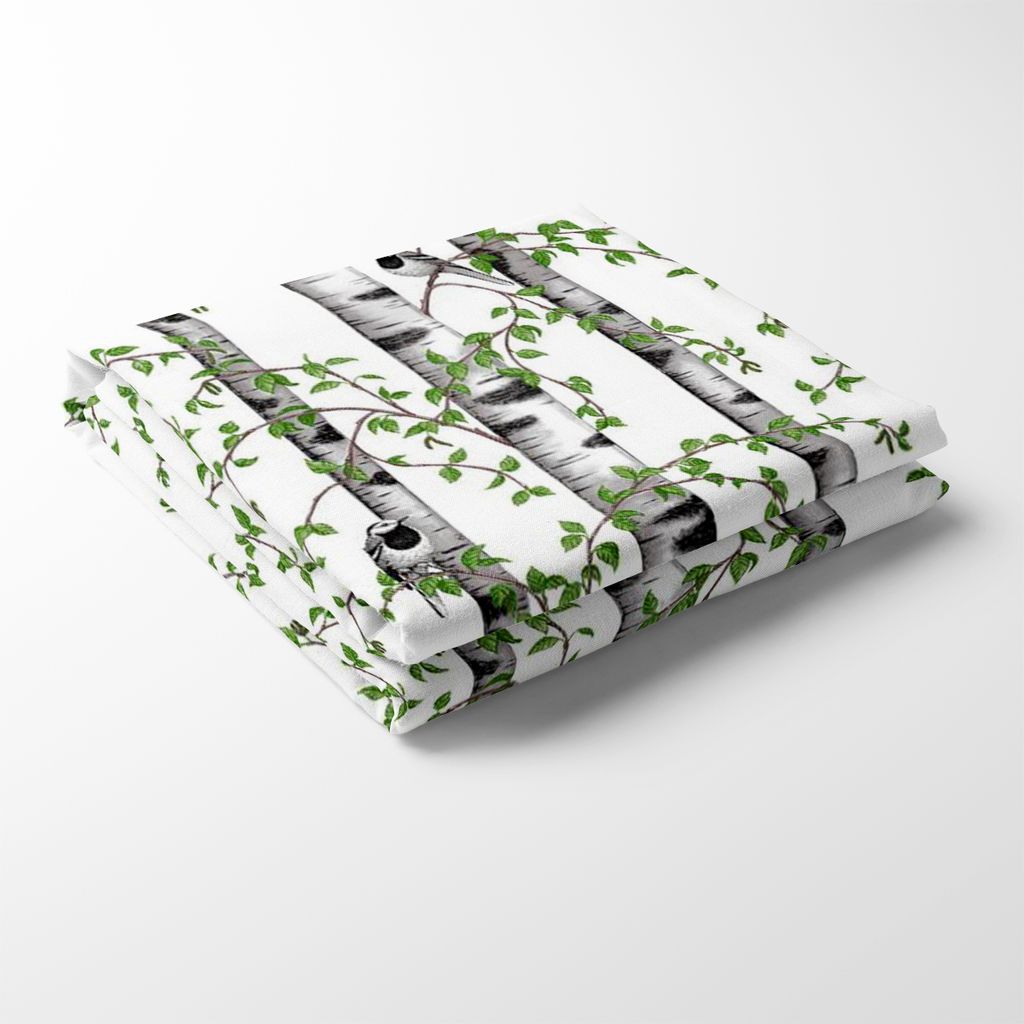 Vacker bordsduk med vit botten, sädesärlor och björkar