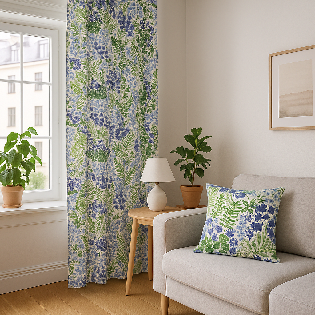 Blå Blom ljusblå är tillverkad i högkvalitativ bomullsblandning som ger ett fint fall och god slitstyrka. Det är ett tyg som både inspirerar och lugnar – ett mönster för dig som älskar naturens rikedom och vill ha en levande men ändå balanserad färgskala i hemmet.