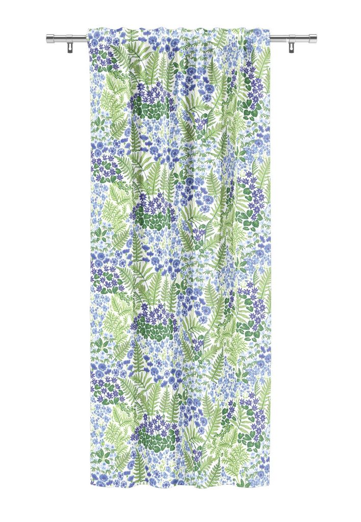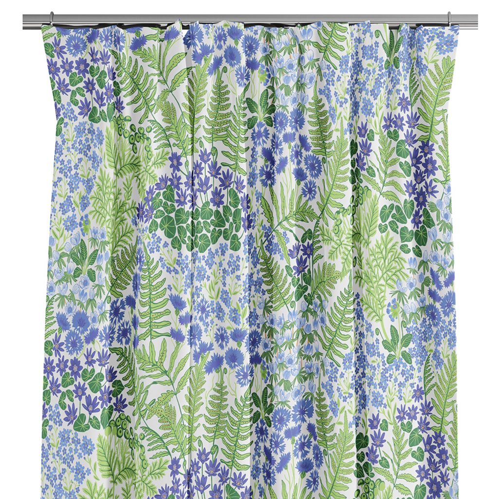 Blå Blom ljusblå gardin är ett friskt och levande gardintyg med somrig känsla, där blåklint, förgätmigej och ormbunksblad dansar mot en ljus bakgrund. Ett vackert inslag i hemmet för dig som vill skapa en naturnära och färgsprakande inramning.