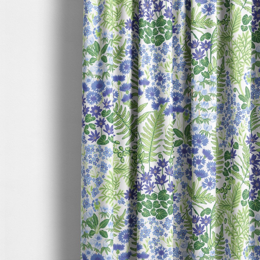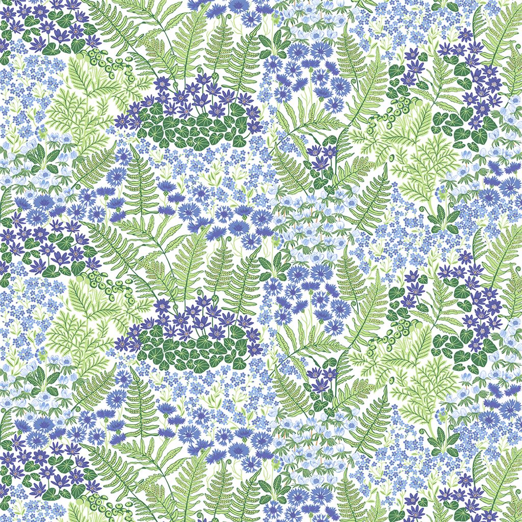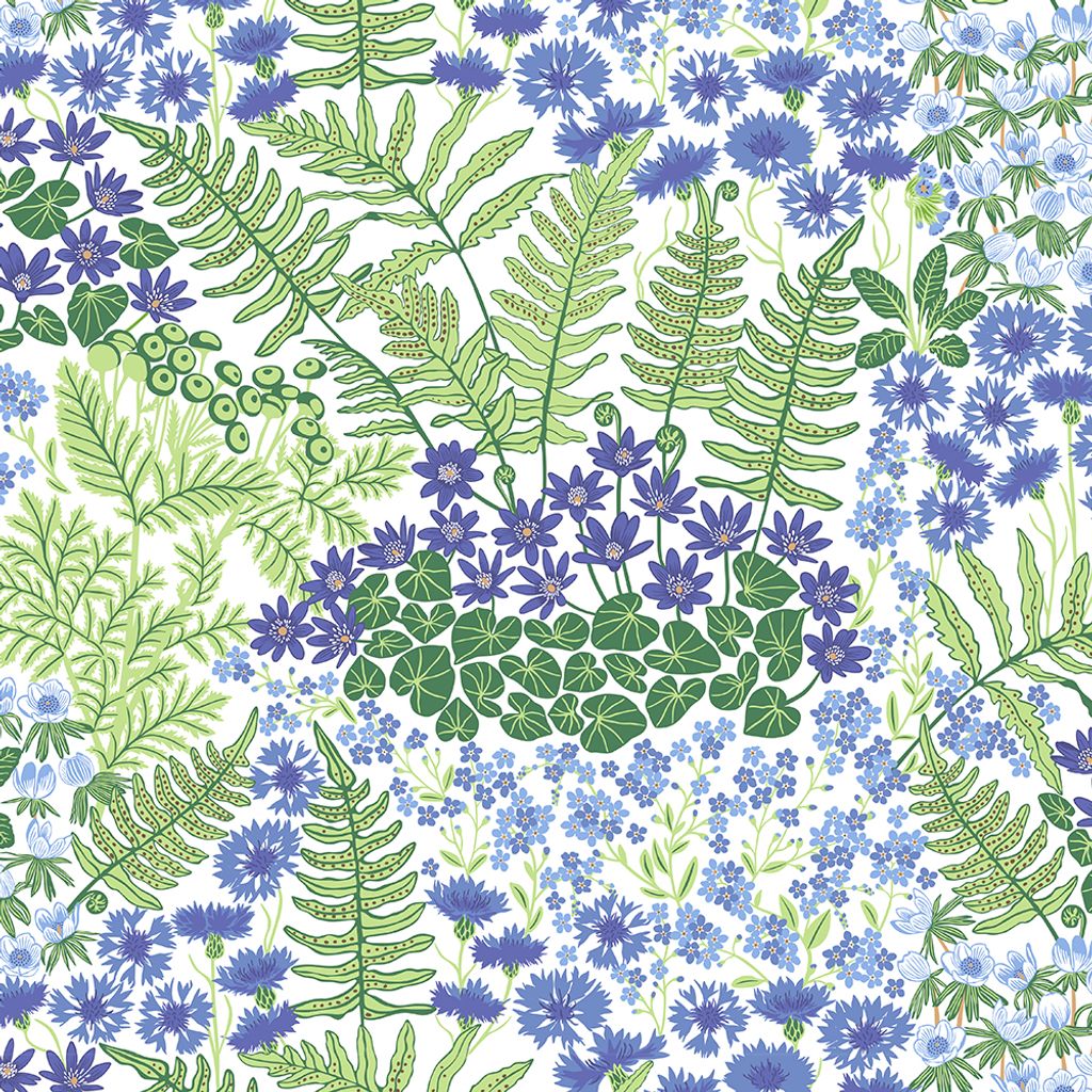 Blå Blom – Ljusblå är ett livfullt och färgstarkt tyg från Arvidssons Textil, designat av Edholm Ullenius. Mönstret bjuder på en somrig symfoni av blå blommor, gröna blad och frodig växtlighet – ljus botten
