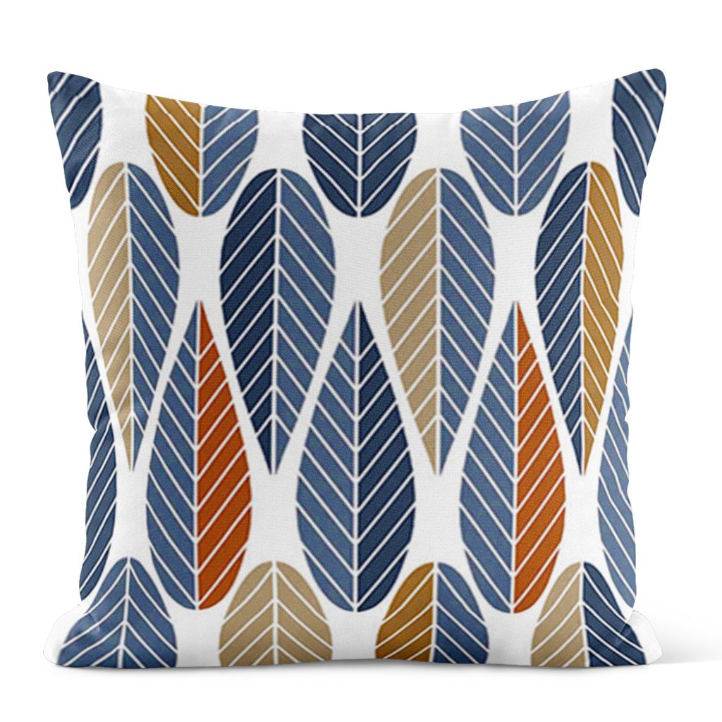 Blader kuddfodral i färgerna blå, beige, orange på en offwhite botten. Fodralet är 47x47cm med ett blixtlås i nederkant.