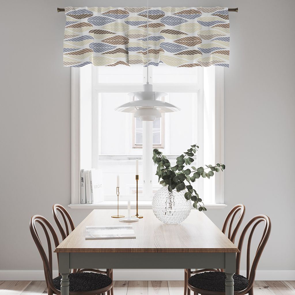 Gardinkappa på metervara, Populära blader i brunt, beige och blått på offwhite botten. Kappan levereras ofållad i kanterna.