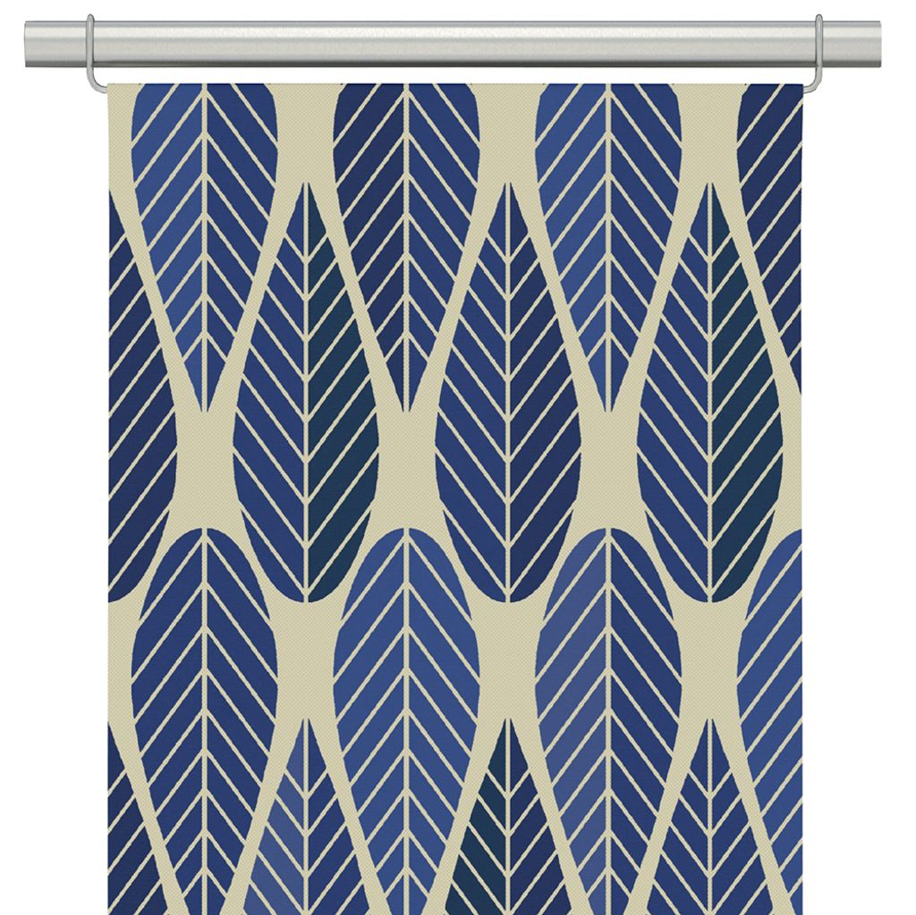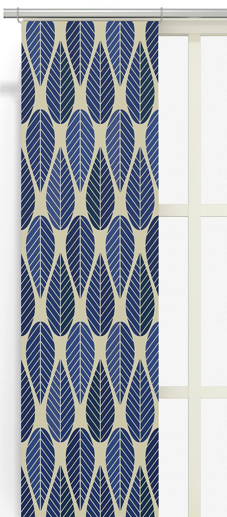 Blader culla blå panelgardin har ett retroinspirerat bladmotiv i djupa blå nyanser mot en linnefärgad botten. En modern och stilren gardin som tillför både karaktär och lugn till rummet.
