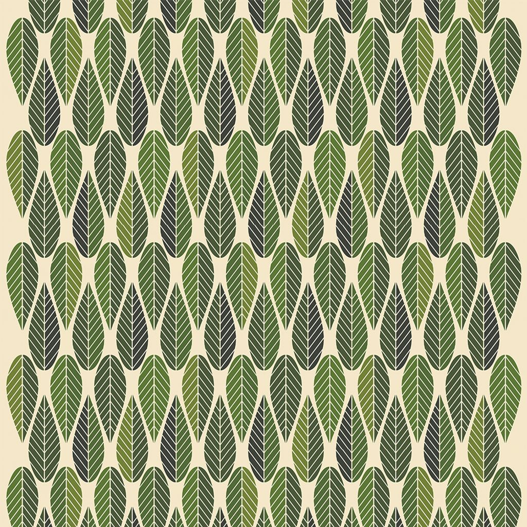 Bladmönstrat tyg i gröna toner – stilren retrodesign på linnefärgad botten.