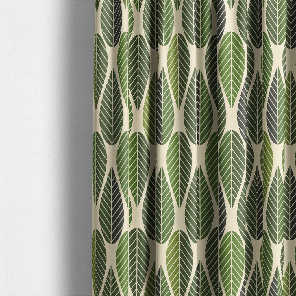 Tyg med grafiskt bladmönster i grönt – en vacker retrodesign på linnefärgad botten för gardiner, kuddar och inredning.