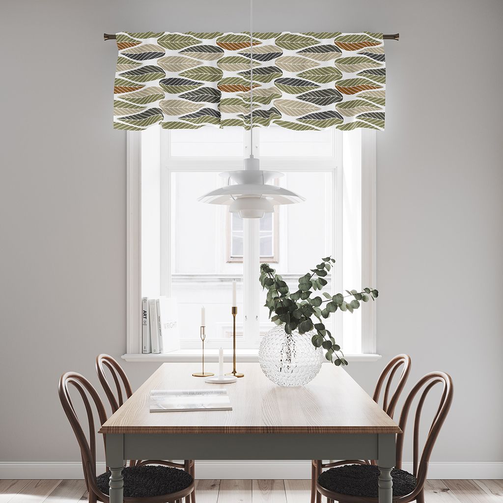 Den grafiska tolkningen av blad ger en modern känsla samtidigt som färgskalan håller uttrycket mjukt och inbjudande. Tyget passar utmärkt till kappor i kök eller matplats, där det ramar in fönstret och bidrar till en ombonad atmosfär. Det fungerar lika fint i ljusa, skandinaviska miljöer som tillsammans med trä, naturmaterial och varmare inredningsdetaljer.