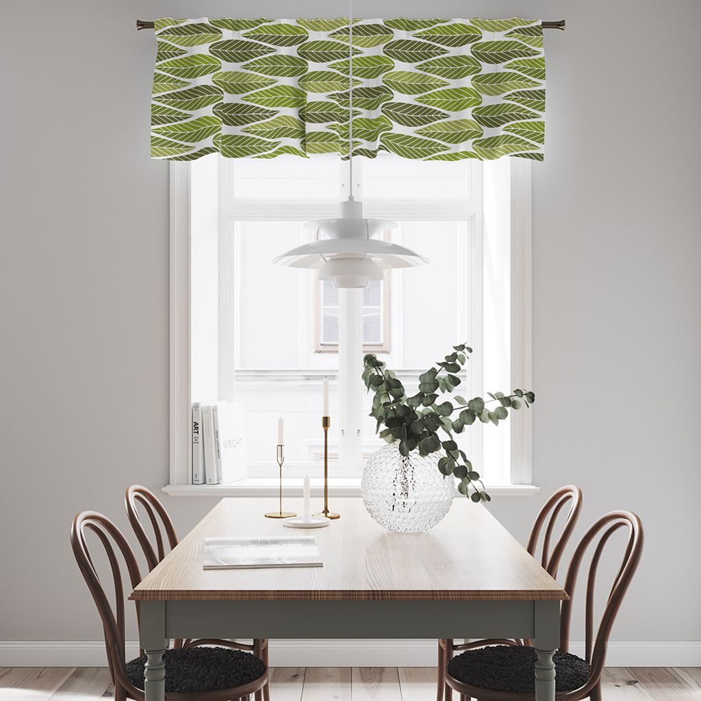 Gardinkappa på metervara i Populära blader i grönt på offwhite botten. Kappan levereras ofållad i kanterna.