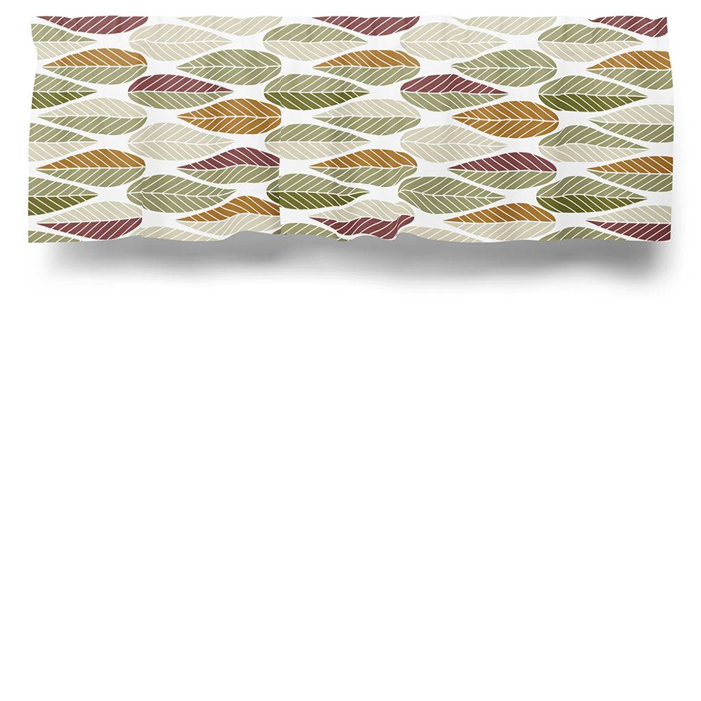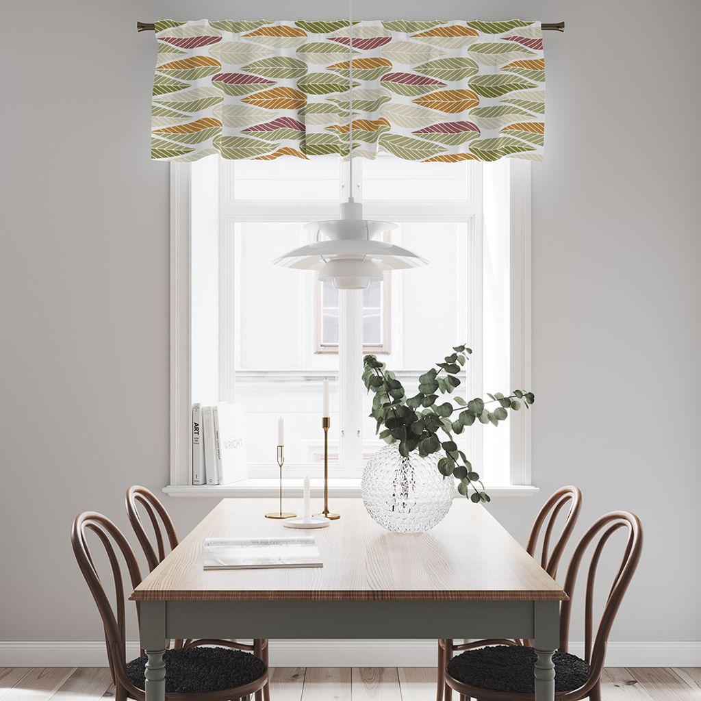 Populära Blader gardinkappa med stora blad i retrostil i grönt, rost och beige på en offwhite botten. Tyget har tryck på framsidan så det är vitt på baksidan.