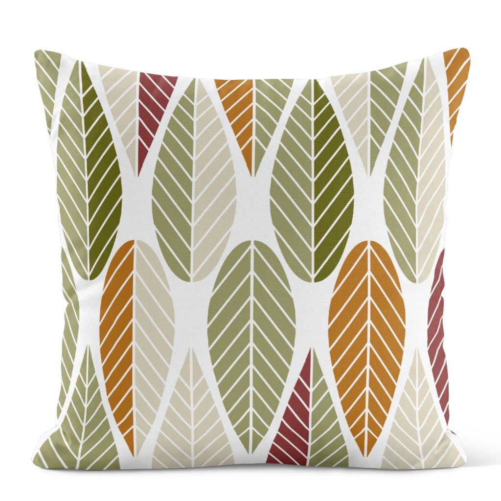 Blader kuddfodral i grönt, beige, rost och vinrött med blad.