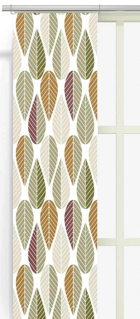 Blader panelgardiner med retro bladmönster i grönt, beige, rost och vinrött på offwhite botten.