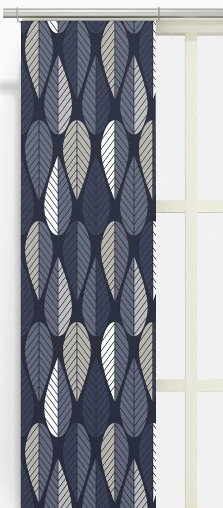 Panelgardiner med retro bladmönster i blått, beige, blått och vitt på en mörkblå botten.