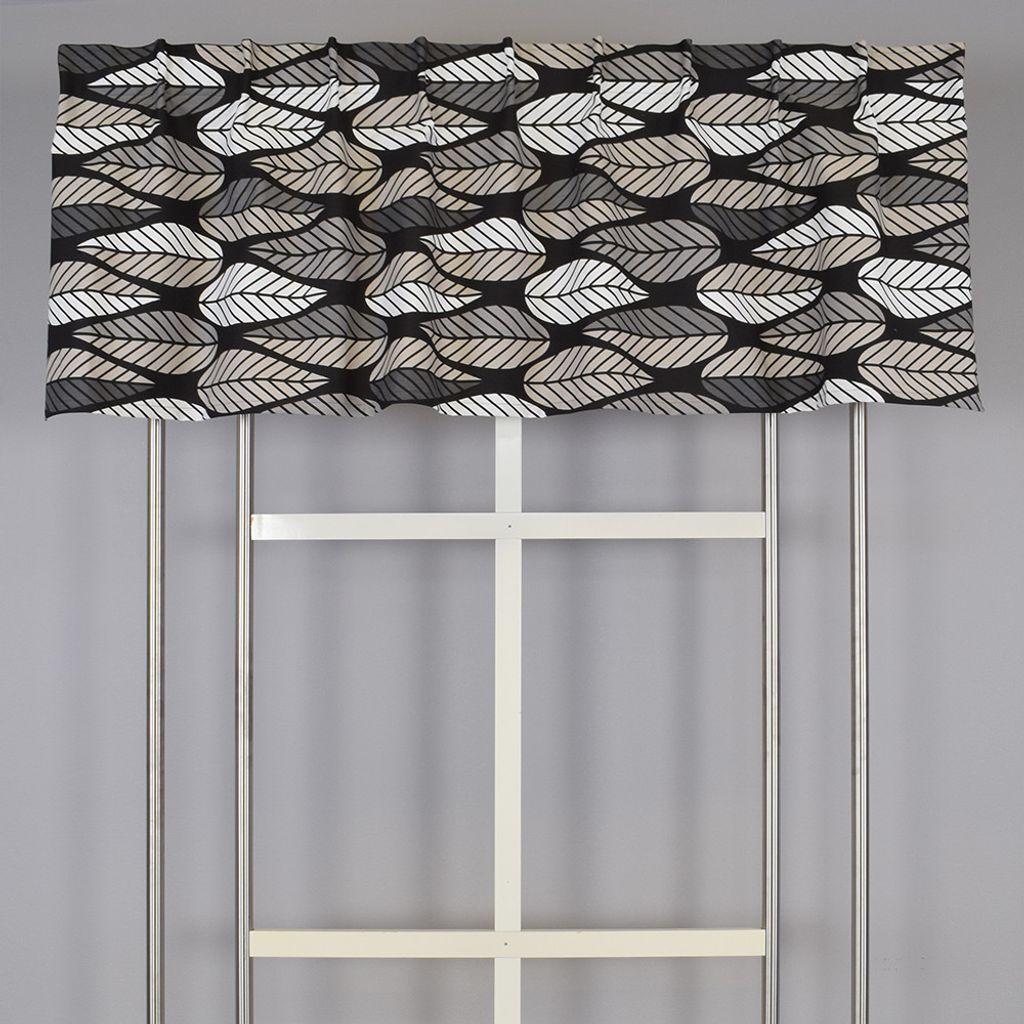 Retro gardinkappa med stora blad i vitt, grått och beige på en svart botten