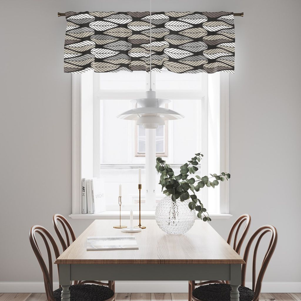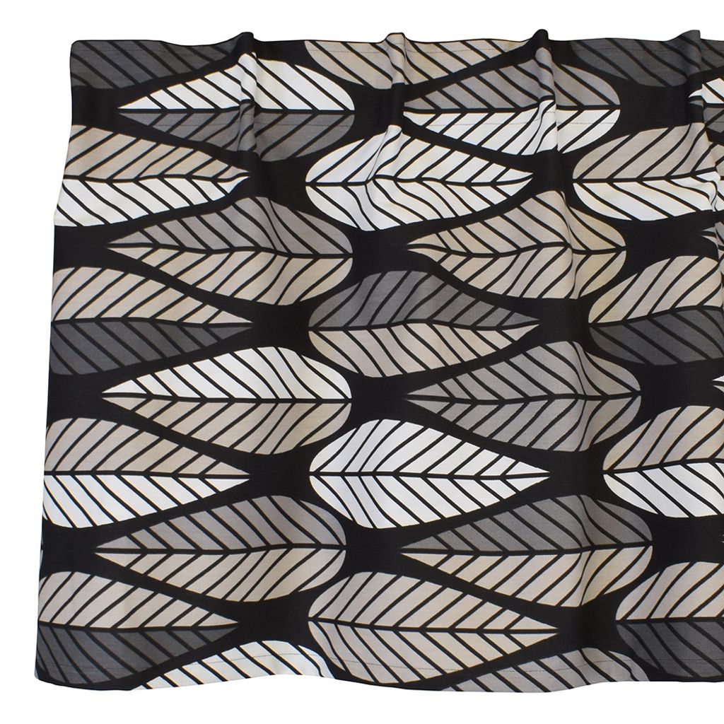 Retro gardinkappa med stora blad i vitt, grått och beige på en svart botten. Gardinkappa på metervara.