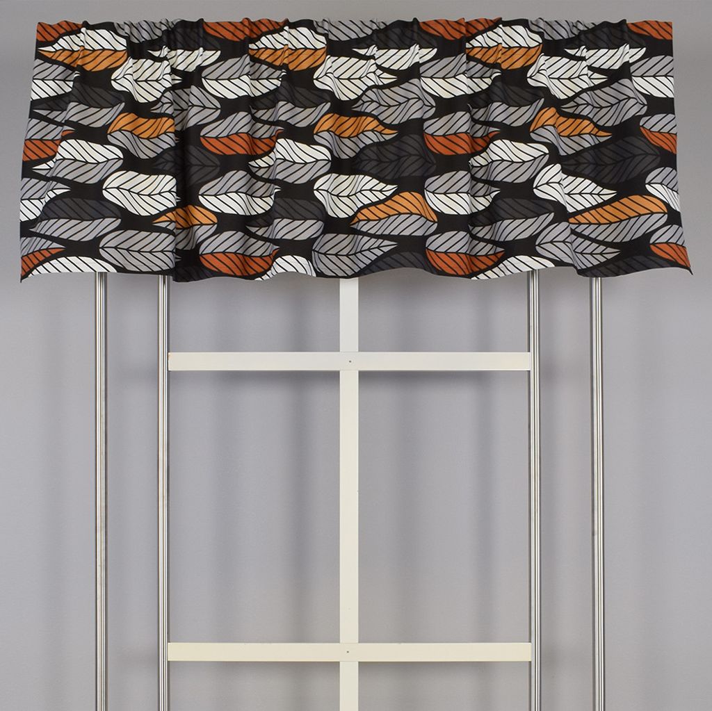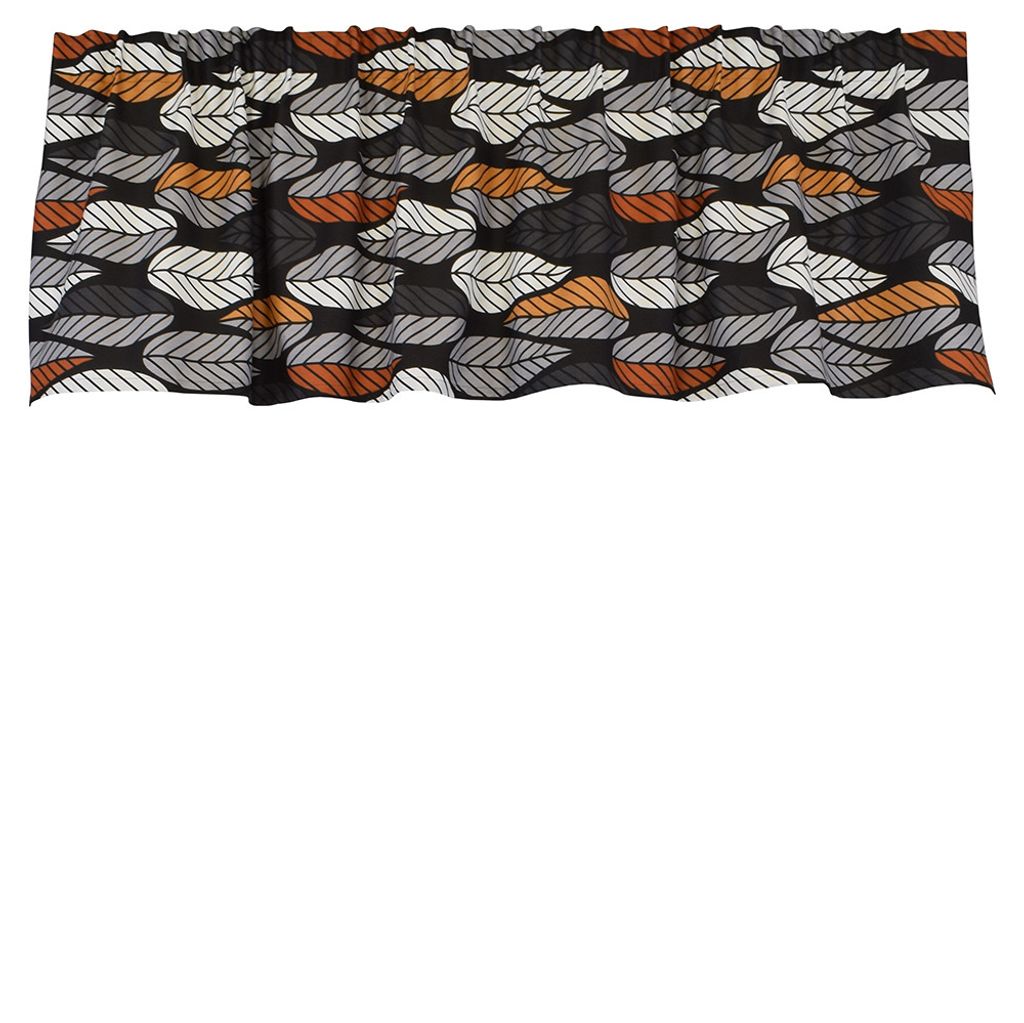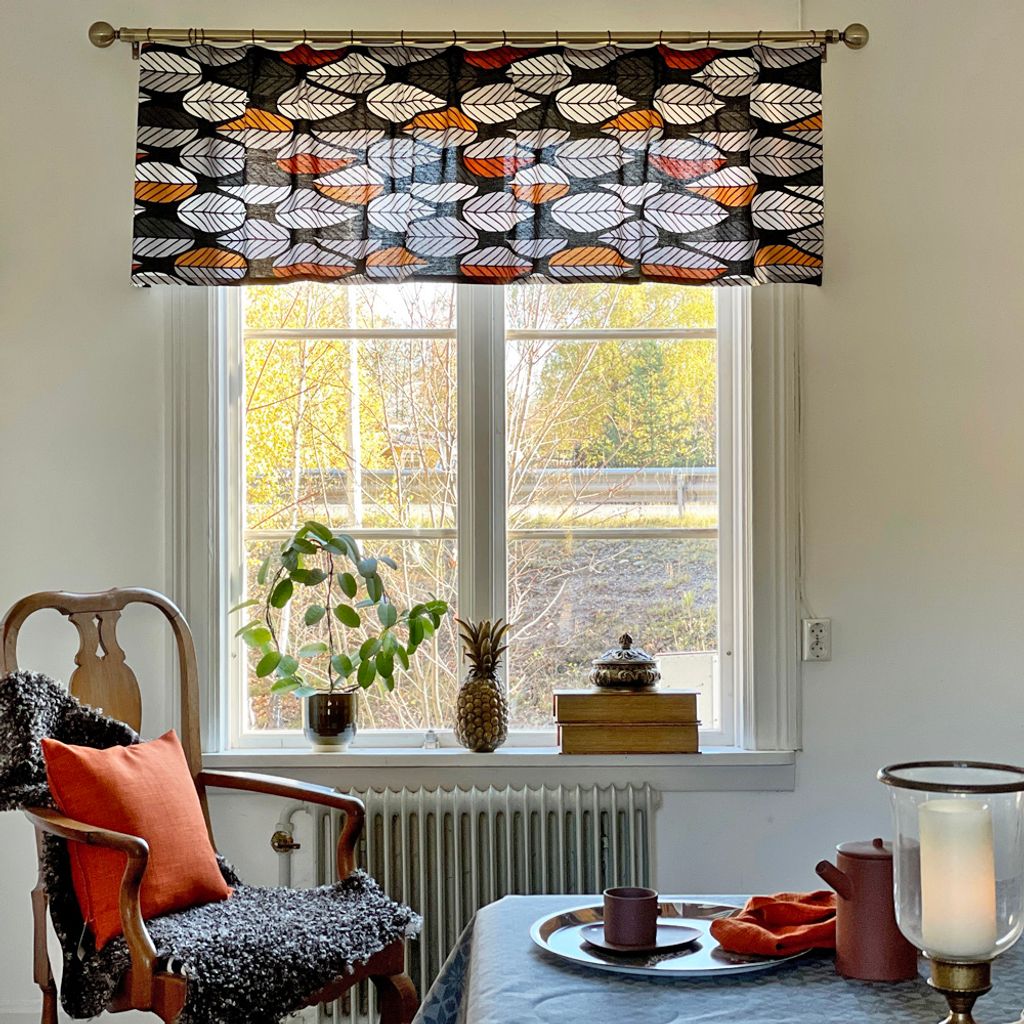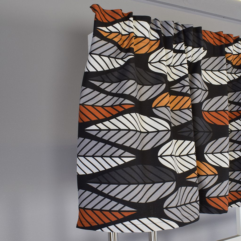 Retro gardinkappa med stora blad i vitt, grått och orange på en svart botten. Gardinkappa på metervara Kappan levereras ofållad i kanterna.