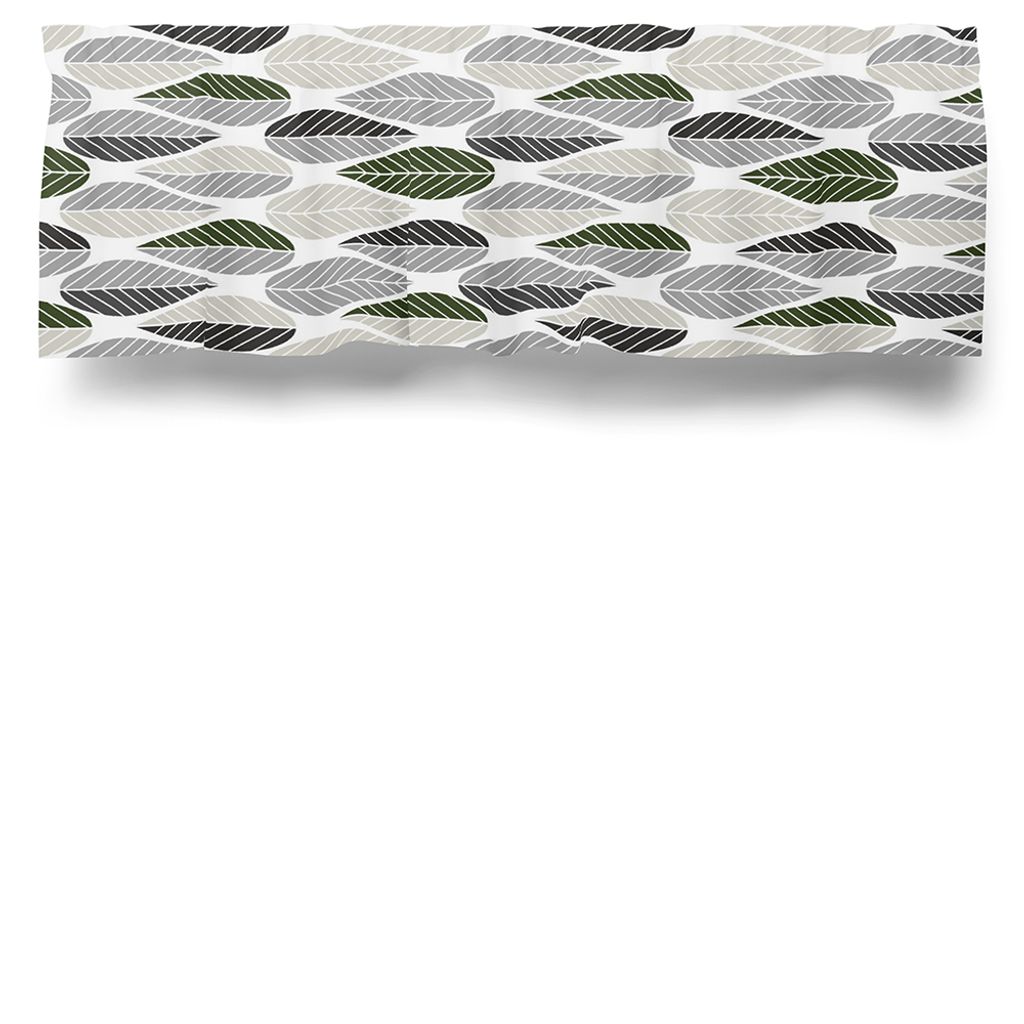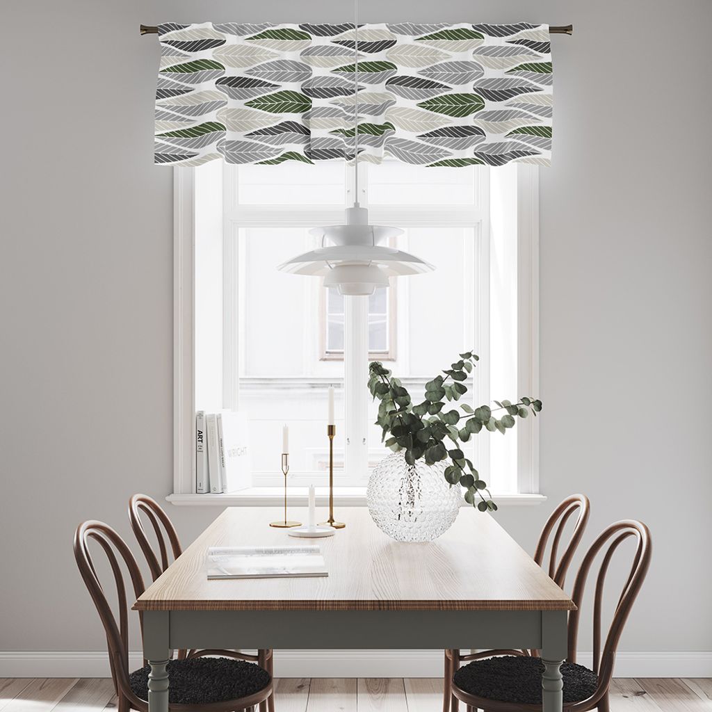 Gardinkappa på metervara, Populära stora blad i grönt, beige och grått på offwhite botten. Kappan levereras ofållad i kanterna.