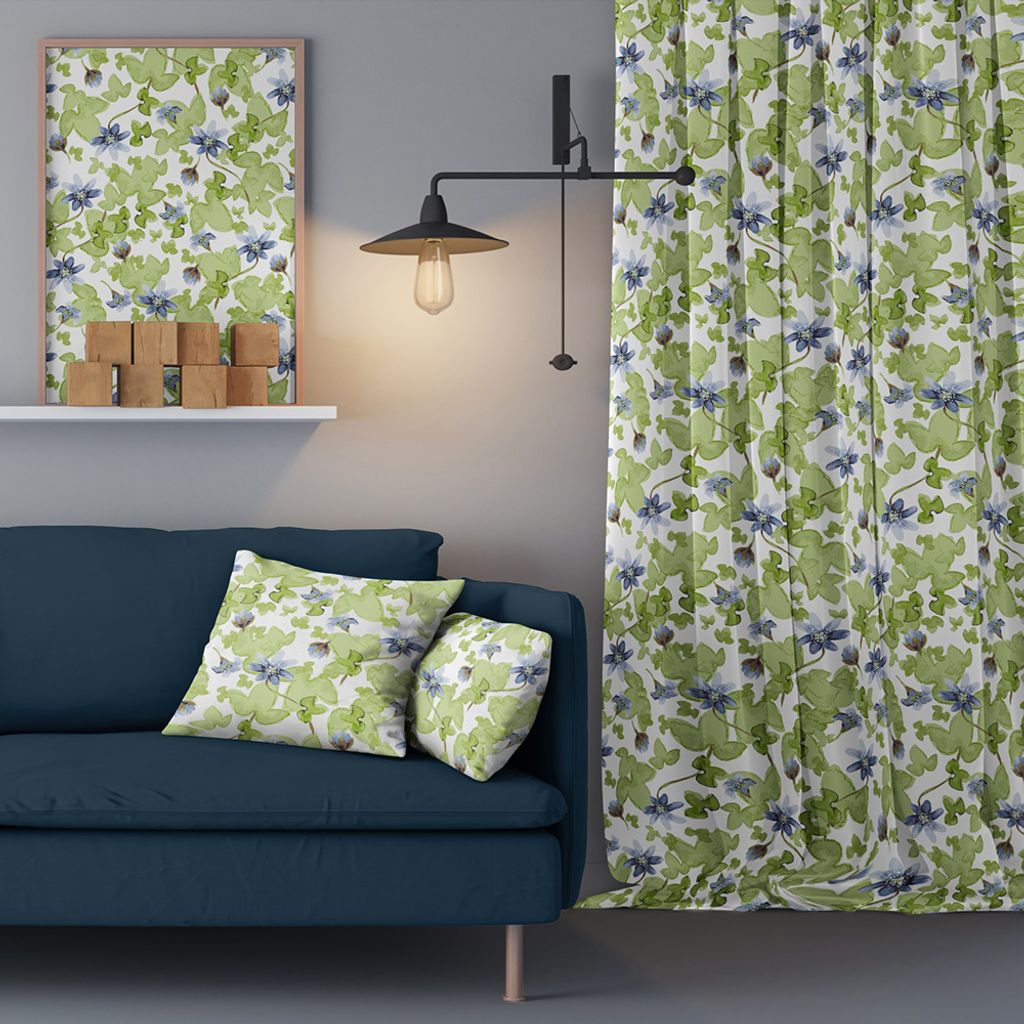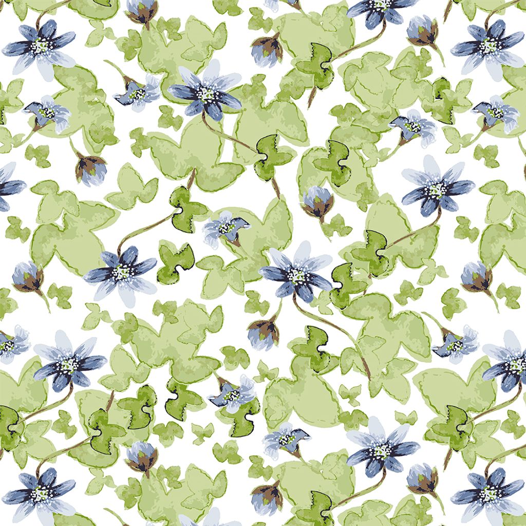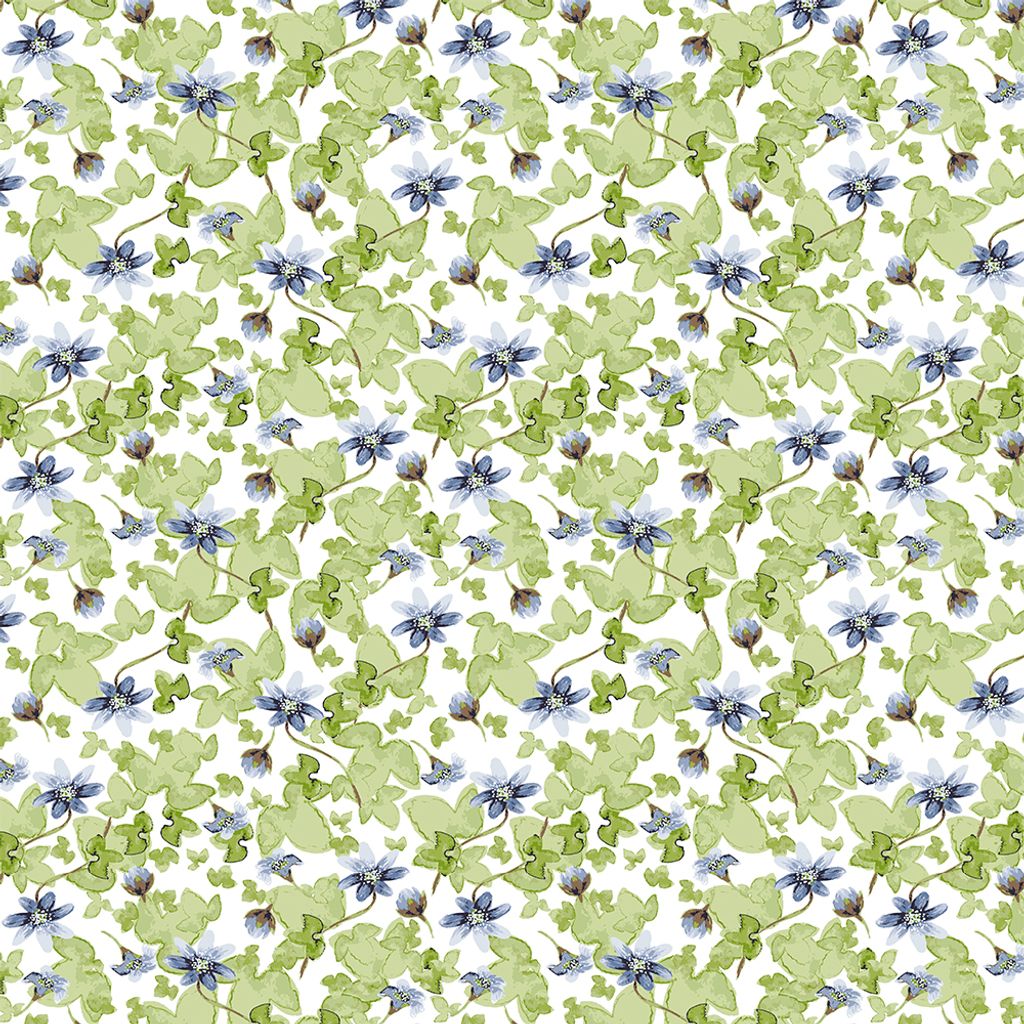 Vackert blommigt tyg med vit botten, gröna blad och blå sippor.