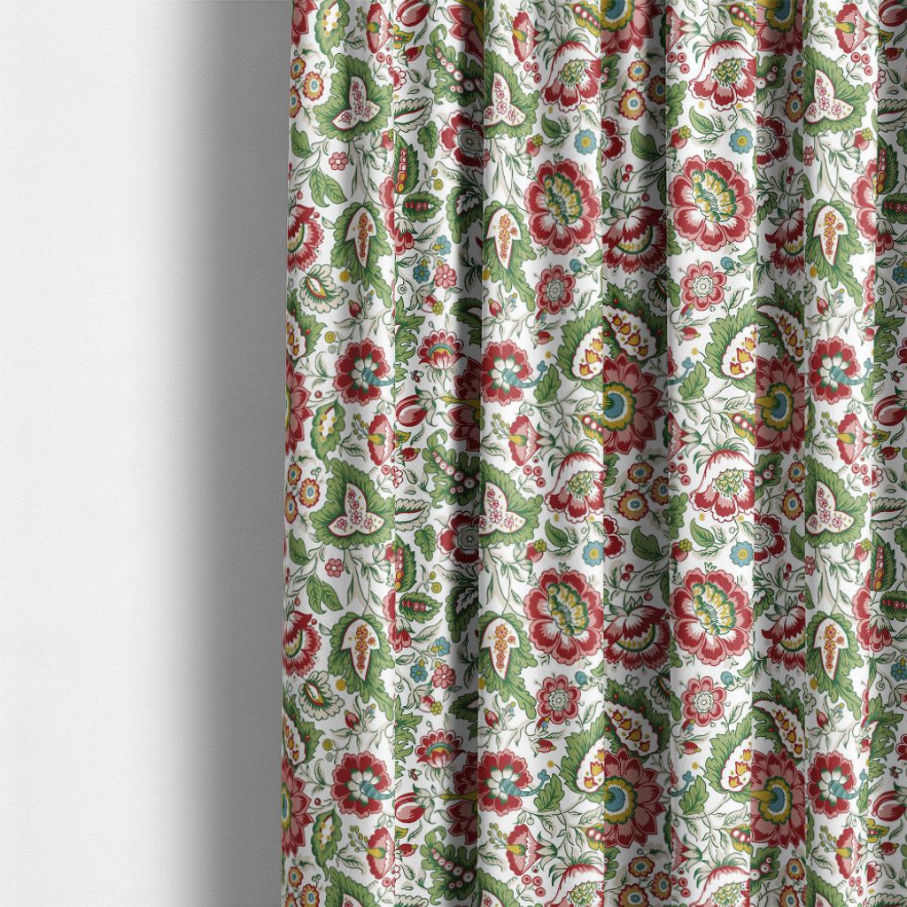 Blombacka ljusgrönär ett detaljrikt tyg i metervara med ett klassiskt, folkloristiskt blommönster i röda, gröna och blå toner. Ett levande och tidlöst tyg som passar perfekt till gardiner, kuddfodral och heminredningsprojekt.