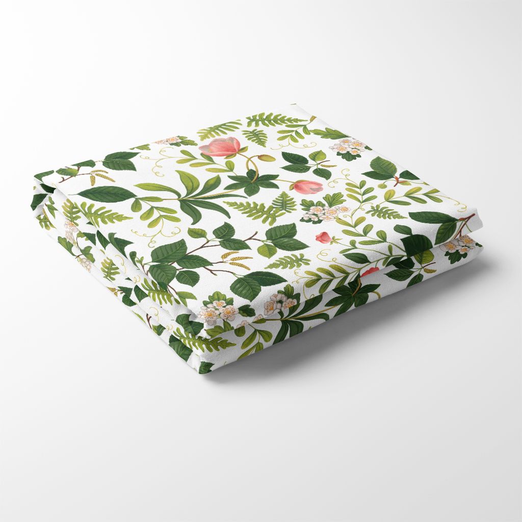 Blomsterlund grön bordsduk har ett naturnära mönster av slingrande gröna blad och rosor i mjuka rosa nyanser. En inbjudande duk som ger en romantisk och levande känsla till dukningen. Duken finns i 4 olika storlekar.