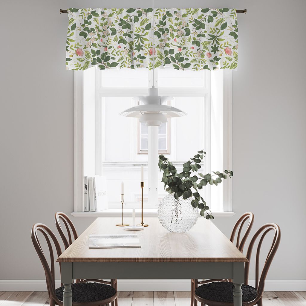 Blomsterlund grön gardinkappa på metervara förvandlar ditt fönster till en blomstrande oas. Mönstret är inspirerat av skandinavisk flora och pryds av slingrande gröna blad, små vita blommor och rosa rosor i milda nyanser. Ett perfekt alternativ för dig som vill skapa en romantisk, lugn och harmonisk inredning med naturliga inslag.