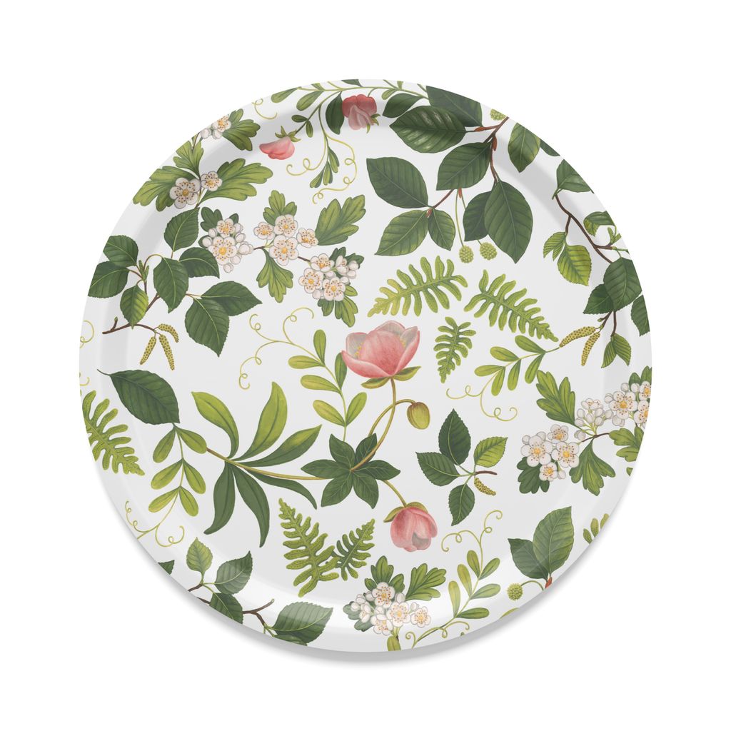Rund 31cm bricka med vackert blommönster i gröna nyanser. Tillverkad i Sverige av hållbart material – perfekt för servering och dekoration.