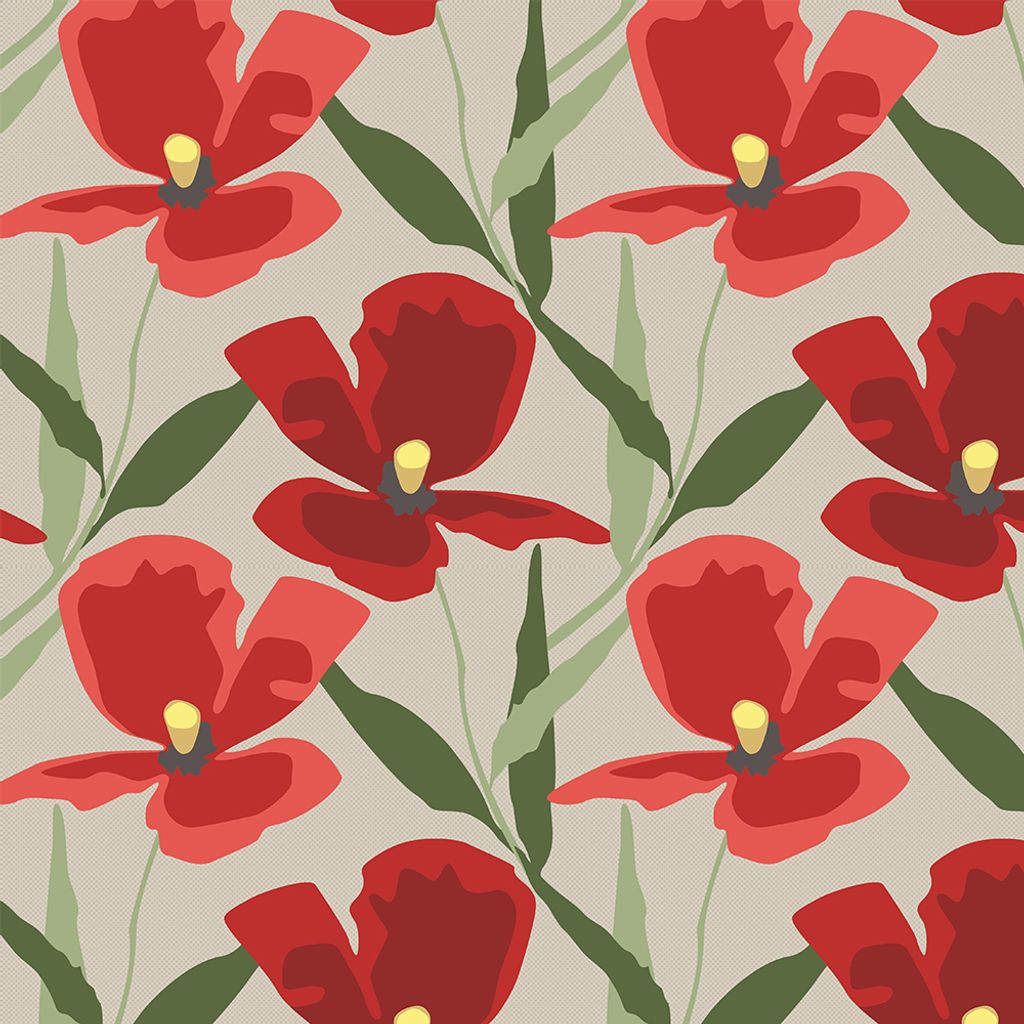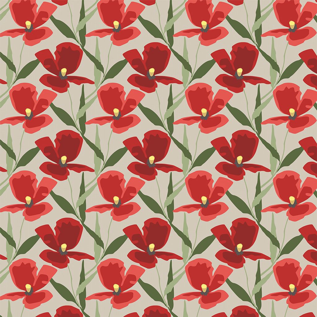 Låt rummet blomma med Blomsterskrud Culla Röd, ett vackert gardintyg från Arvidssons Textil. Mönstret består av stiliserade blommor i rött och lavendelfärgade nyanser mot en mjuk, beige bakgrund.