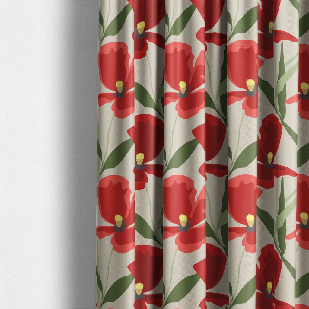 Mjukt gardintyg med blommigt mönster i rött, gönt och beige – skapar lugn och trivsel i rummet.
