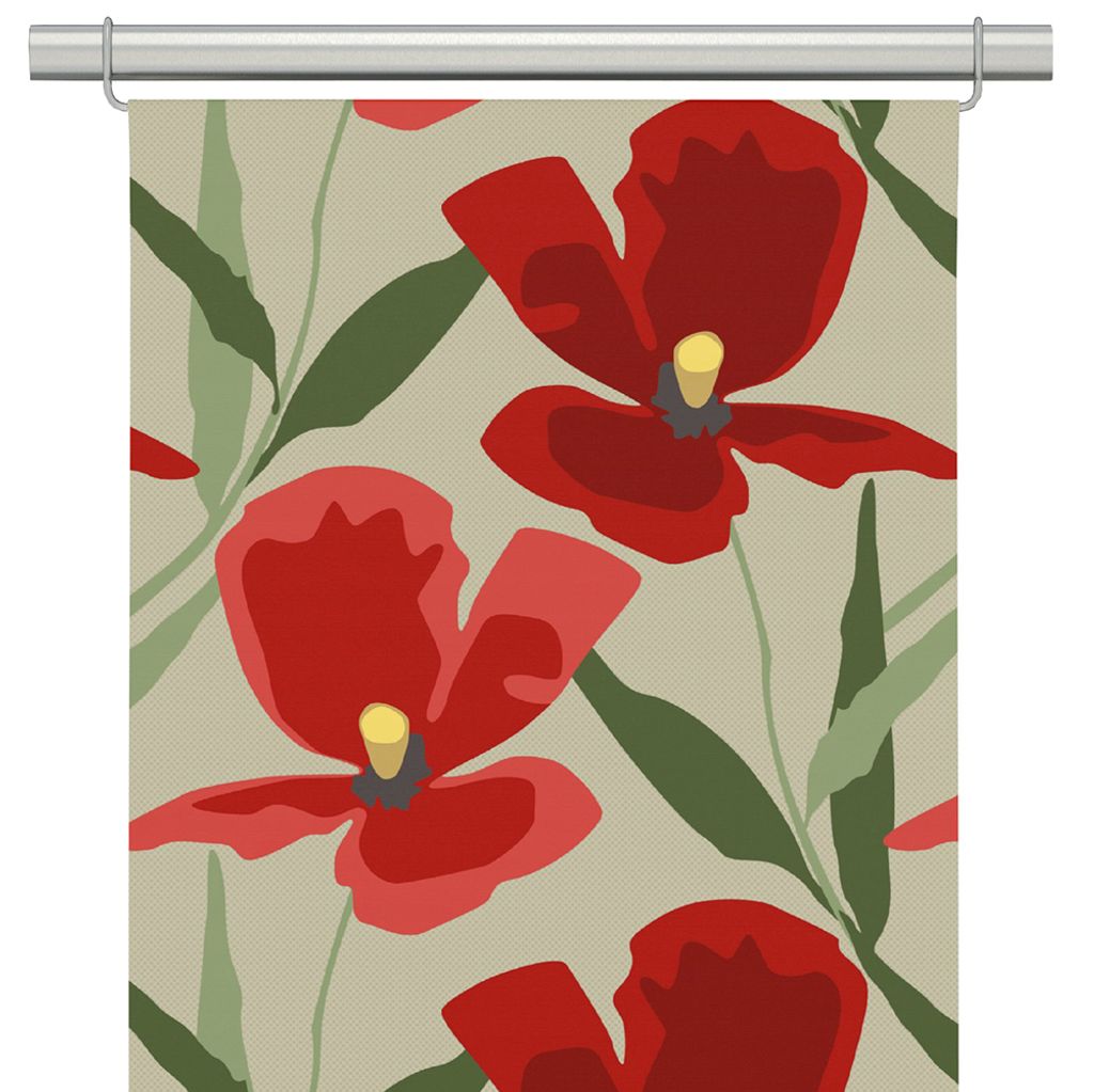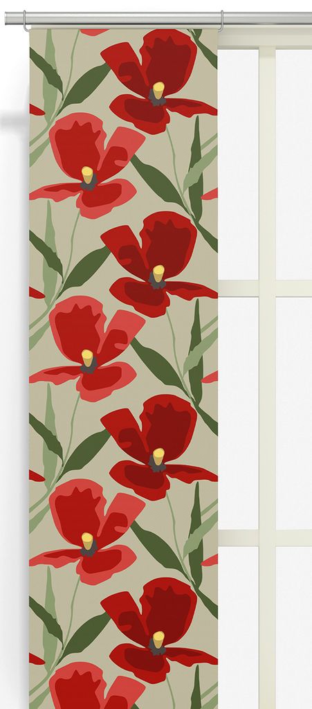 Panelgardiner med stora blommor i röda och gröna toner. Mönstret är uttrycksfullt och samtidigt harmoniskt – en perfekt kombination för dig som vill sätta personlig prägel på rummet med en varm och naturlig färgskala.