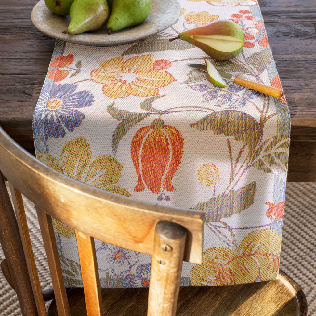 Blomsterslinga löpare' 35X120 cm, tradition och miljötänk. Varje löpare är GOTS-certifierad och förmedlar en känsla av naturens skönhet direkt till ditt hem.